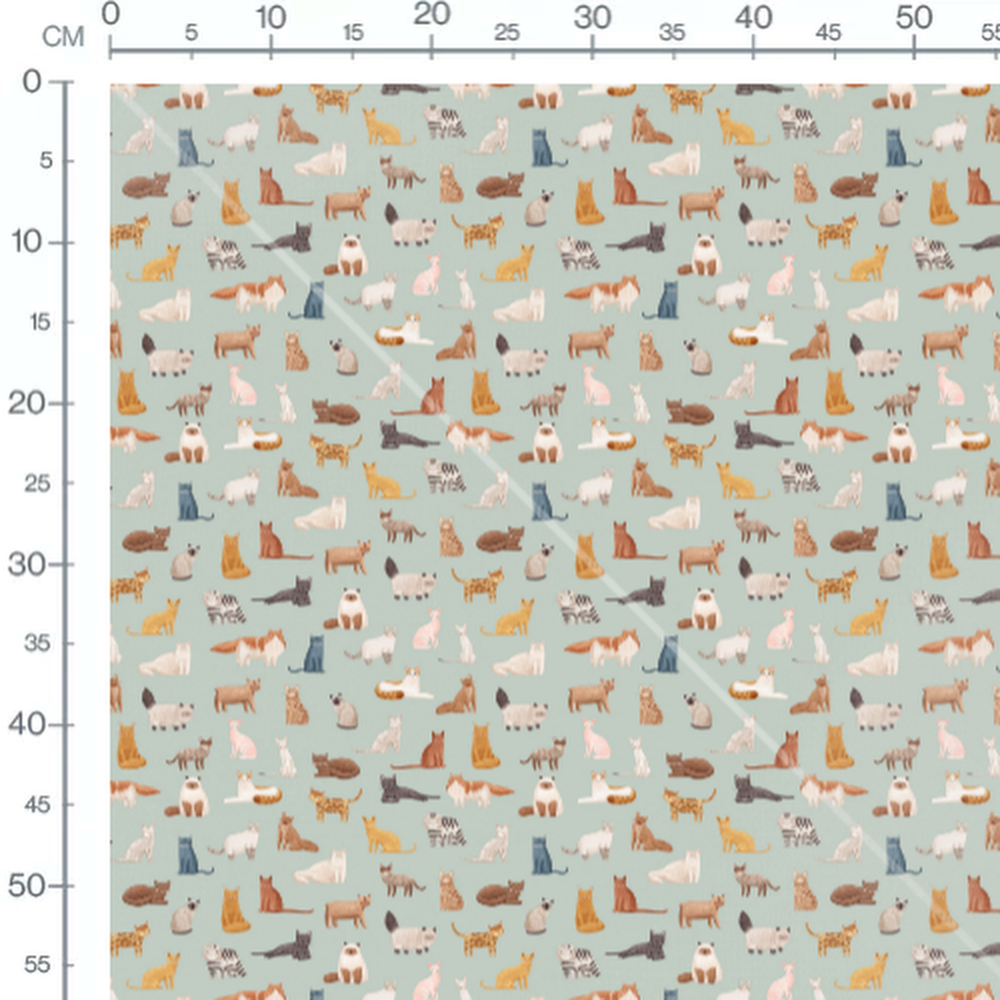 Certains chats sont assis tandis que d'autres sont couchés. Les motifs incluent des chats tigrés, unis et bicolores. Les expressions des chats varient, ajoutant de la diversité au motif.Les tissus