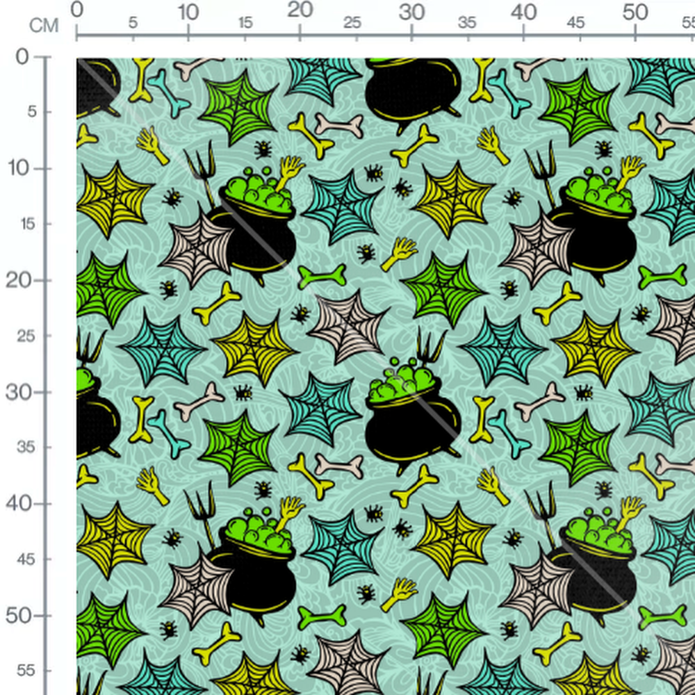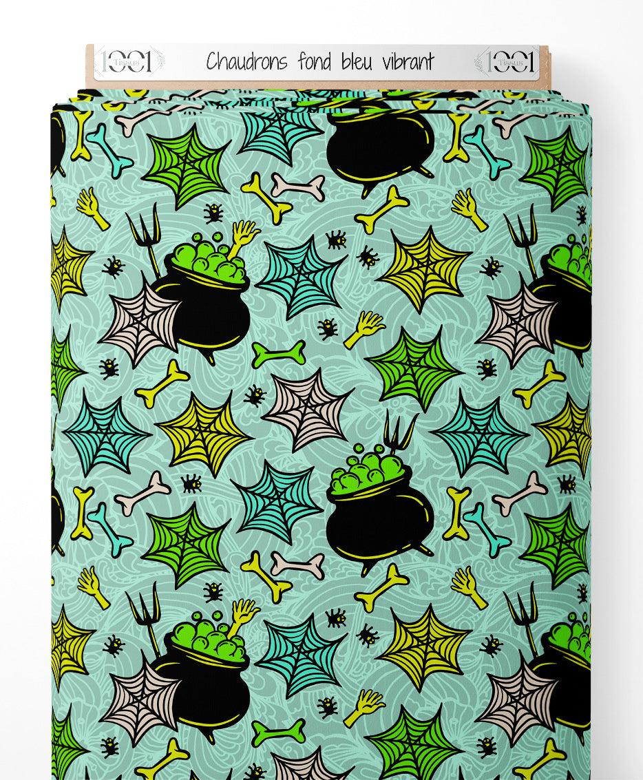 Petites araignées noires dispersées sur le fond bleu. Os et mains jaunes ajoutent un effet effrayant. Les toiles d'araignée sont de différentes couleurs, incluant le vert et le jaune. Les chaudrons noirs sont remplis de bulles vertes. Le fond bleu présente des motifs tourbillonnants subtils.Les tissus
