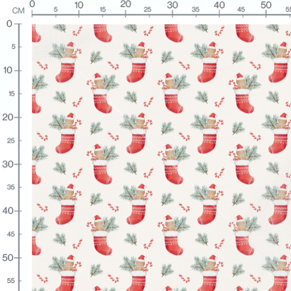 Les bonhommes pain d'épices portent des chapeaux de Noël rouges. Les chaussettes rouges sont ornées de motifs blancs. Les cannes à sucre sont rayées rouges et blanches. Les branches de sapin ajoutent une touche de verdure.Les tissus