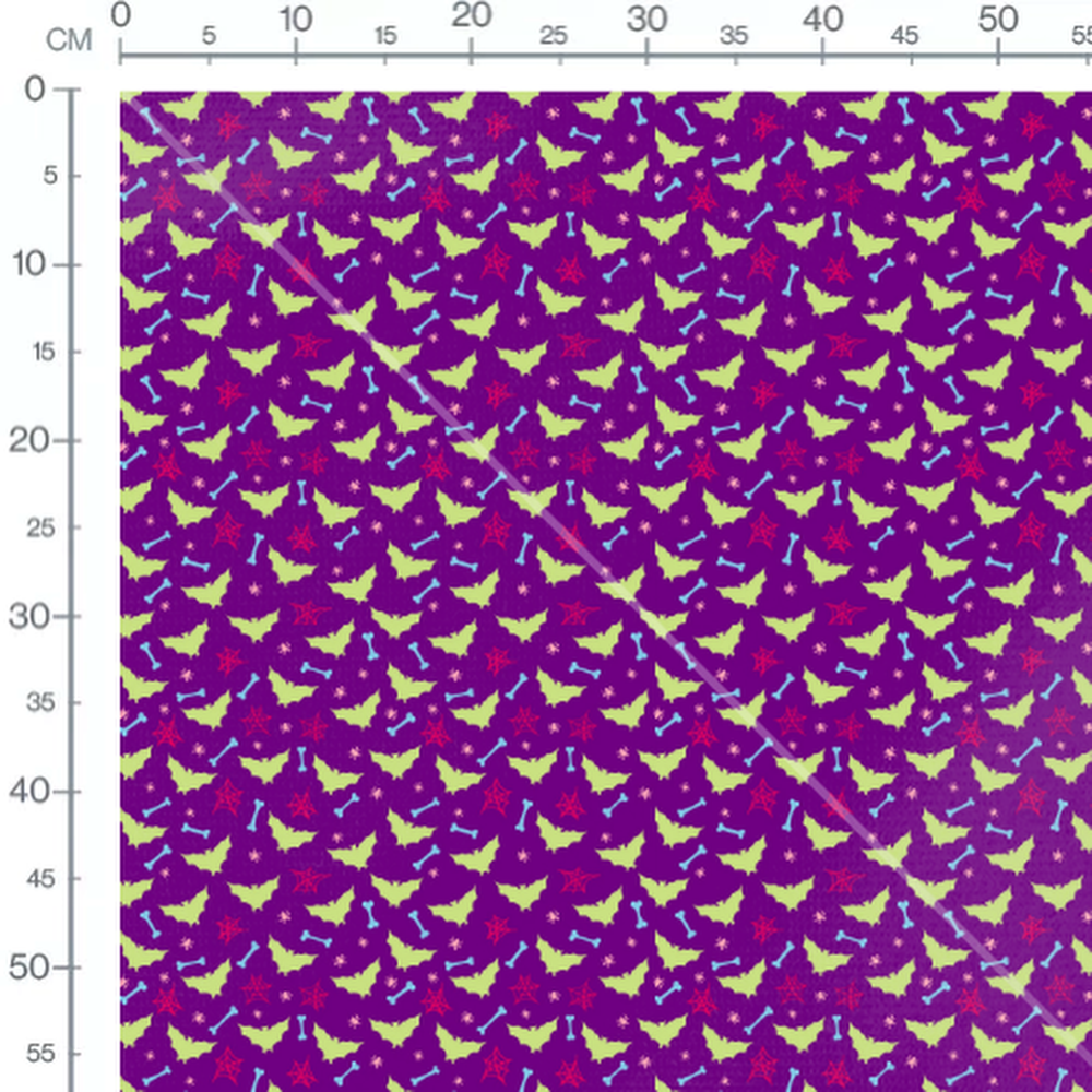Les chauves-souris sont dispersées parmi des os de couleur vive. Les toiles d'araignée ajoutent une touche effrayante au motif. De petites étoiles blanches complètent le design.Les tissus
