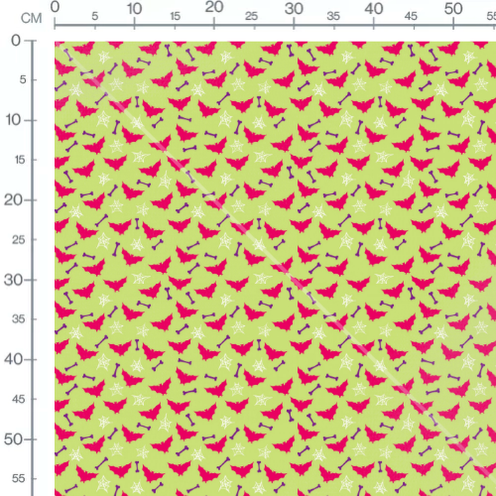 Les chauves-souris rouges sont accompagnées de toiles d'araignée blanches. Des os violets ajoutent un élément supplémentaire au motif. Le fond vert clair met en valeur les couleurs vives des motifs.Les tissus