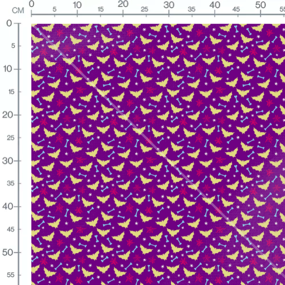 Les chauves-souris jaunes se détachent sur le fond violet. Les toiles d'araignée rouges ajoutent une touche effrayante. Des os bleus et des flocons blancs sont dispersés dans le motif.Les tissus