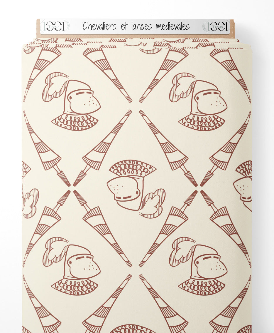 Les casques de chevaliers sont accompagnés de motifs de lances. Les lances sont décorées de rayures marron.Les tissus