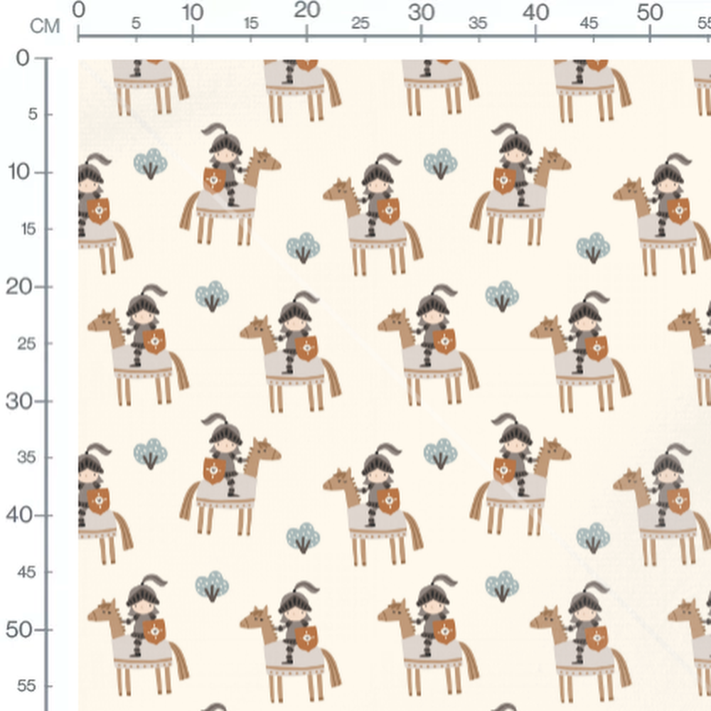 Les chevaliers portent des armures grises et tiennent des boucliers orange. Les chevaux sont représentés avec des détails simples et des couleurs douces. Les arbres ajoutent une touche de couleur avec leur teinte bleue.Les tissus