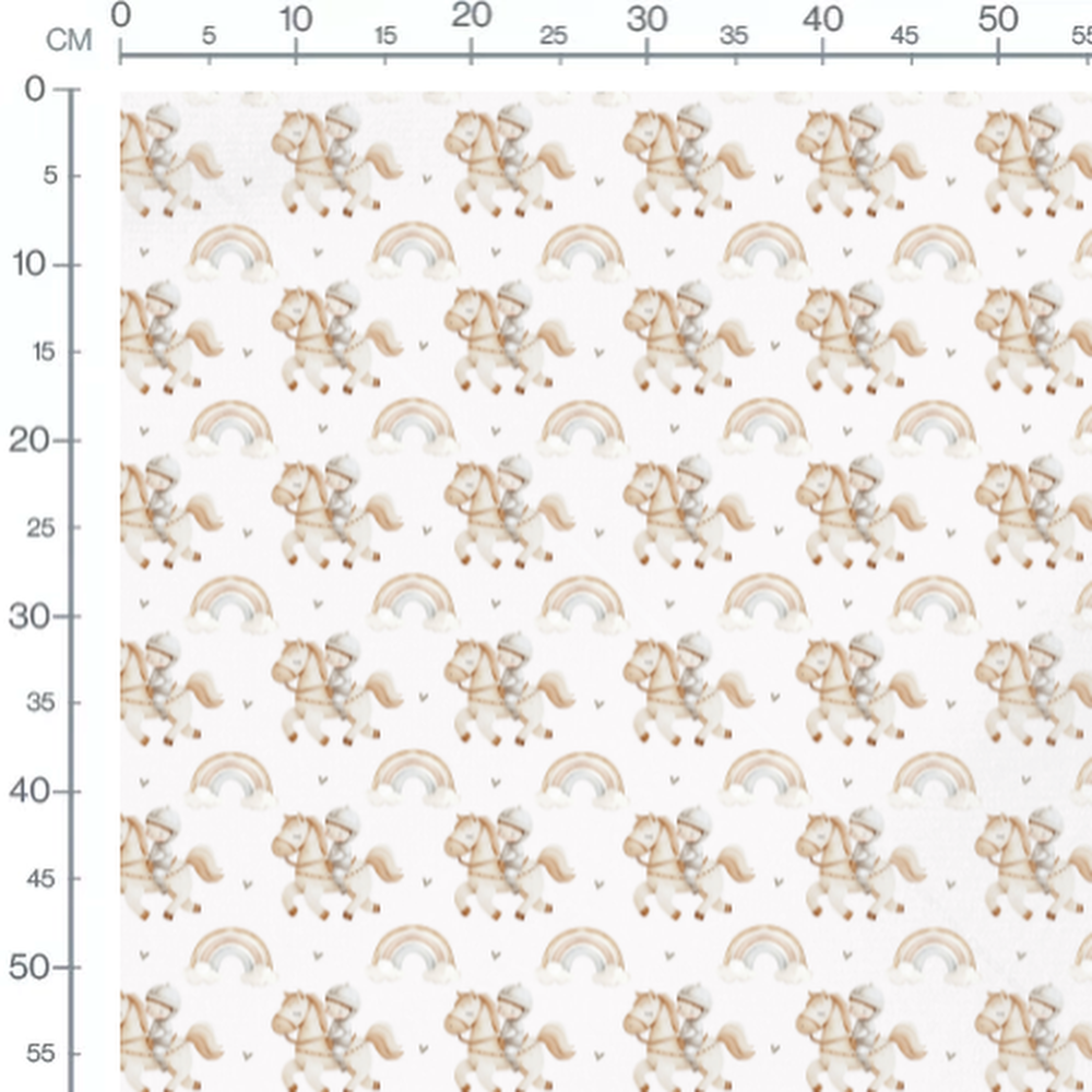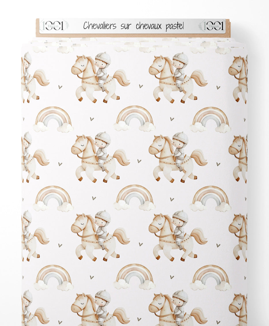 Les chevaliers portent des armures grises et montent des chevaux aux crinières ondulées. Les arcs-en-ciel sont entourés de petits nuages blancs. De petits cœurs gris sont dispersés sur le fond blanc.Les tissus