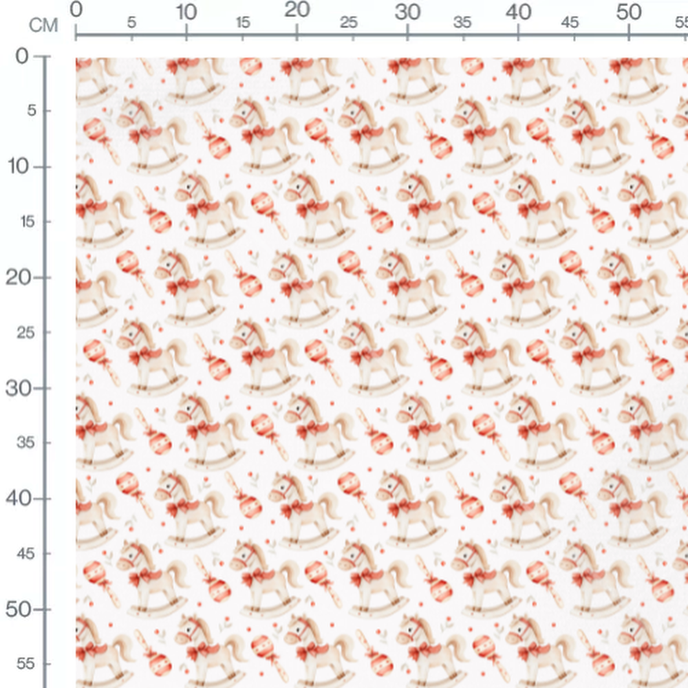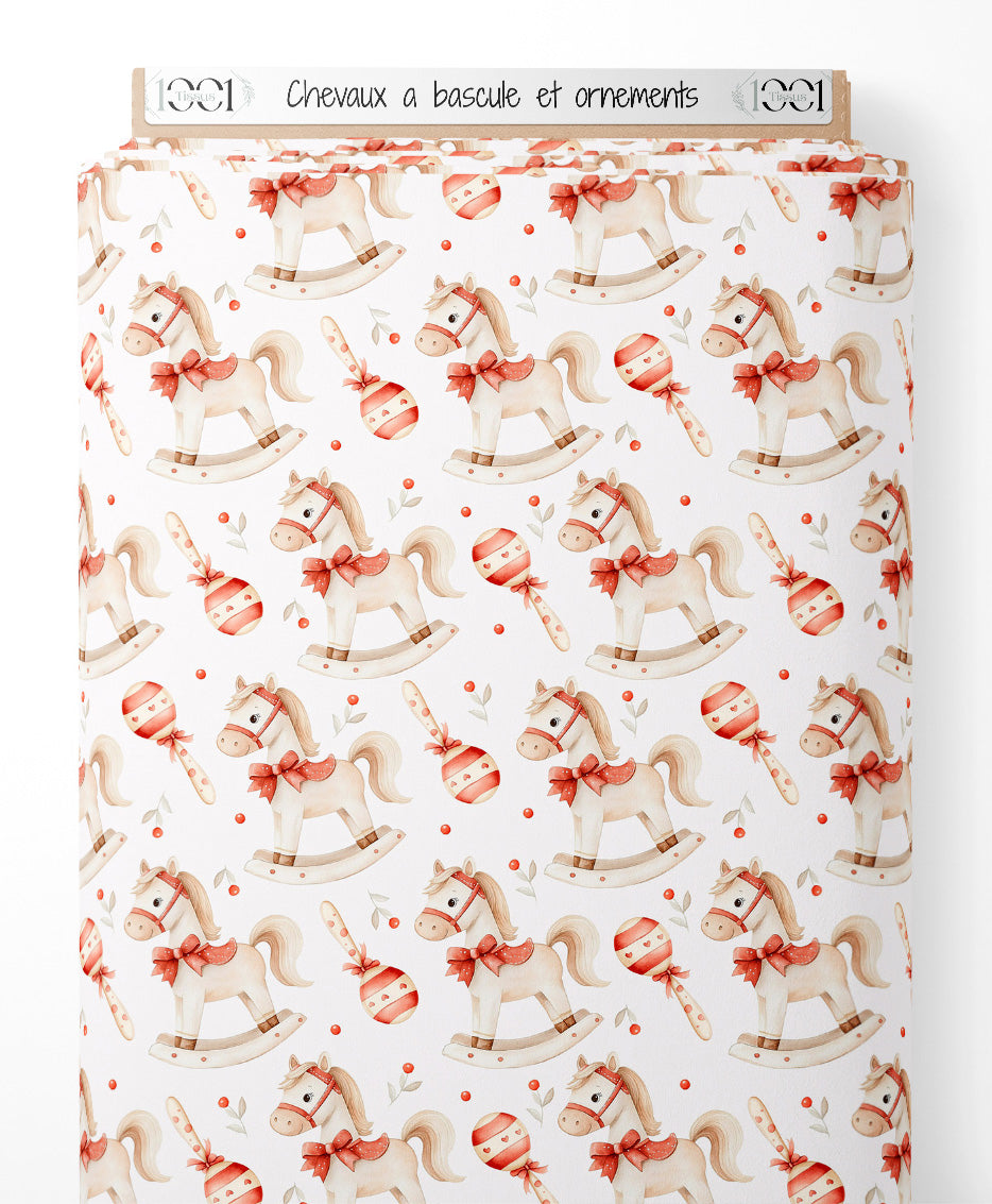 Les chevaux à bascule sont décorés de rubans rouges. Les boules de Noël sont ornées de motifs rouges et blancs. De petites feuilles grises ajoutent une touche délicate au motif.Les tissus