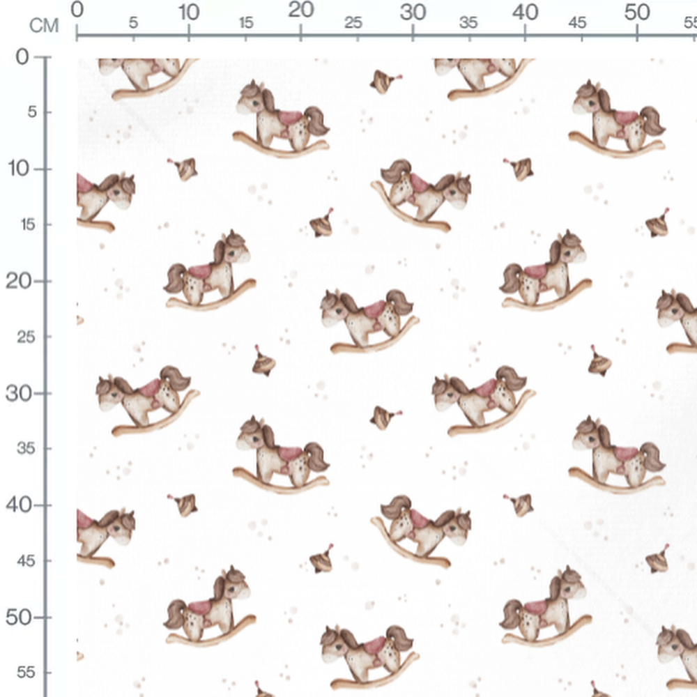 Les chevaux à bascule sont accompagnés de petites toupies marron. Les motifs sont disposés de manière aléatoire sur le fond blanc.Les tissus