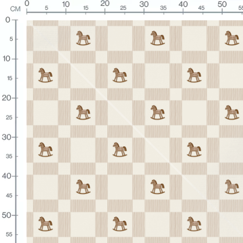 Les chevaux à bascule sont ornés de motifs floraux sur leur corps. Le fond à carreaux alterne entre des sections unies et des sections rayées.Les tissus