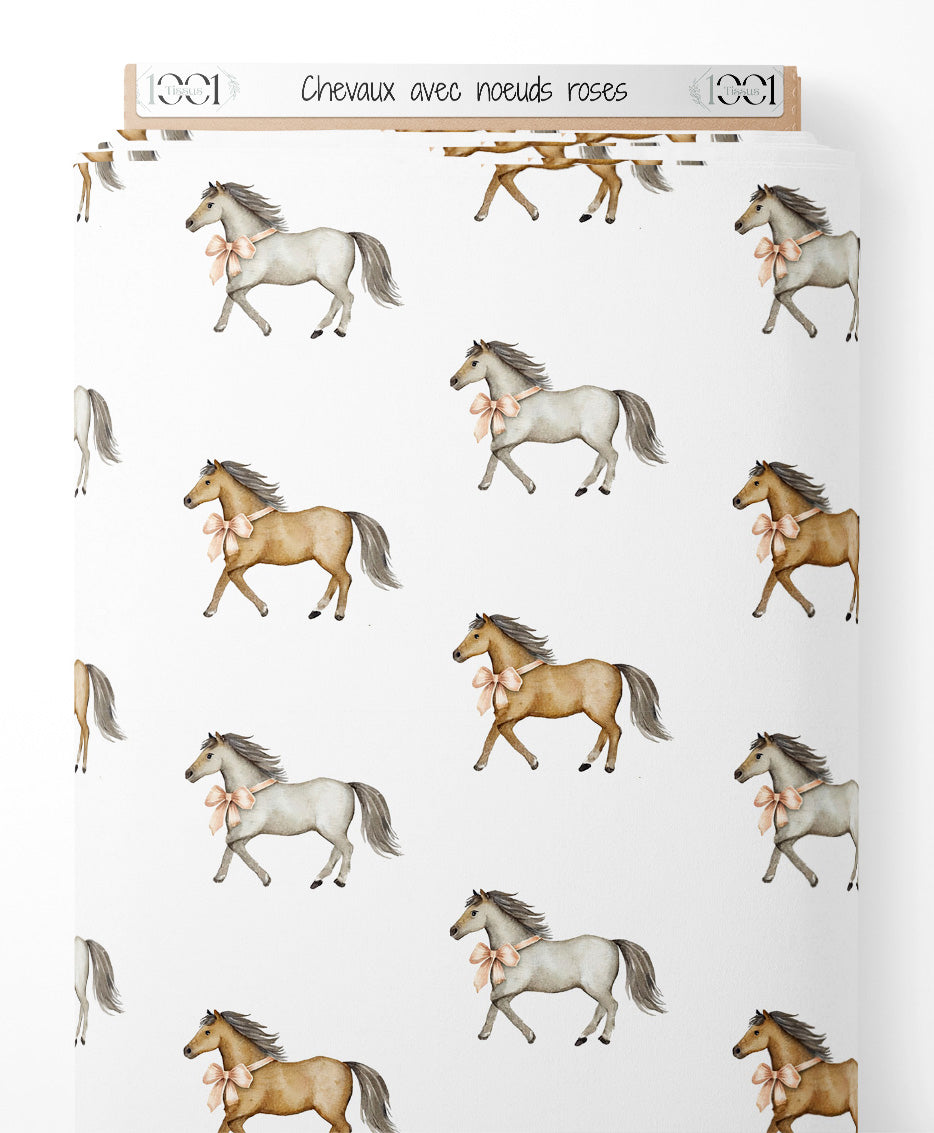 Les chevaux sont ornés de nœuds roses autour du cou. Le fond blanc met en valeur les détails des chevaux.Les tissus