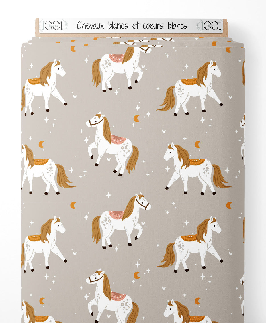 Les chevaux portent des selles décorées de motifs. Des petits cœurs blancs sont dispersés sur le fond. Les étoiles et croissants ajoutent une touche magique au motif.Les tissus