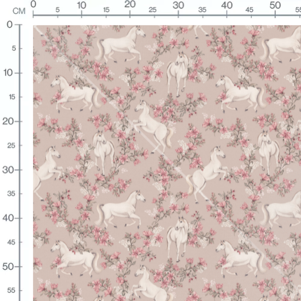 Les chevaux sont dessinés dans des poses variées. Les fleurs roses et blanches sont délicatement dispersées autour des chevaux. Les feuilles grises ajoutent un contraste subtil au motif.Les tissus