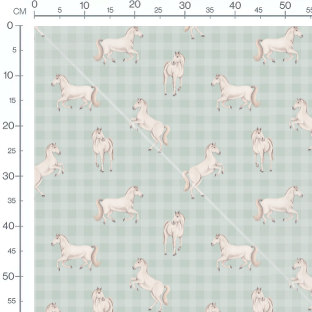 Les chevaux présentent des détails fins avec des crinières et des queues légèrement ombrées. Le fond vert est orné de carreaux subtils, ajoutant une touche classique au motif.Les tissus
