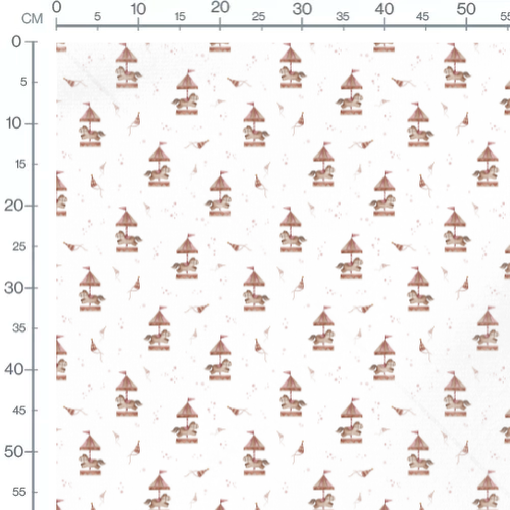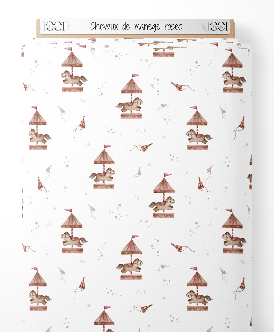 Les chevaux de manège sont accompagnés de petits drapeaux à motifs. Des pois roses parsèment le fond blanc, ajoutant une touche ludique.Les tissus