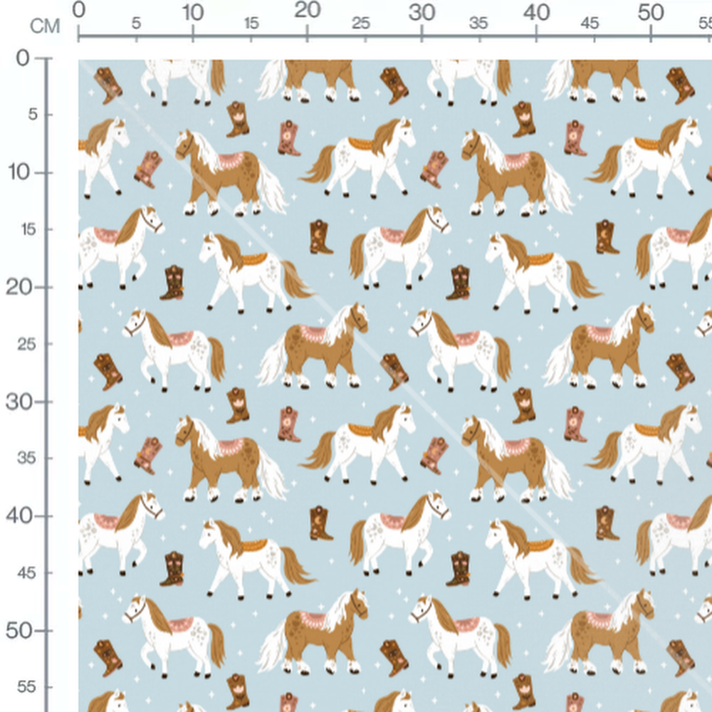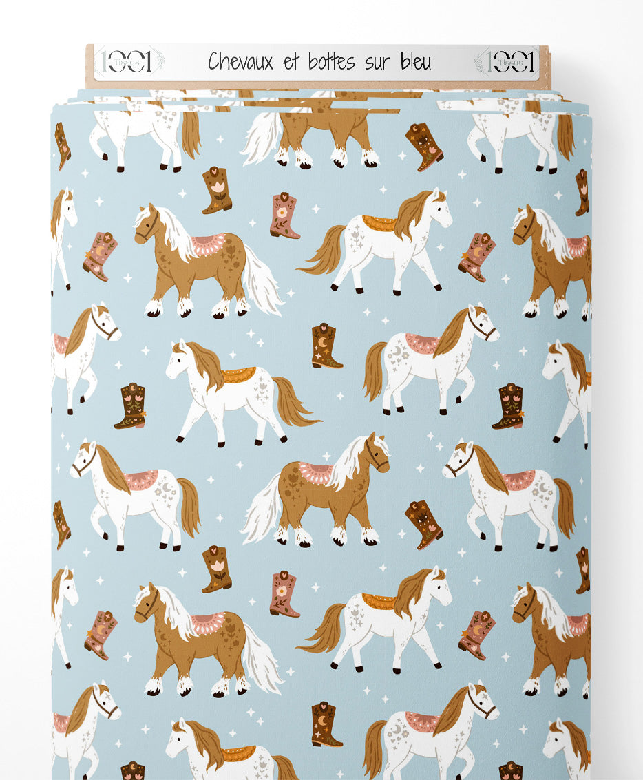 Les chevaux ont des selles décorées de motifs floraux. Les bottes présentent des motifs de lune et d'étoiles. De petites étoiles blanches parsèment le fond bleu clair.Les tissus