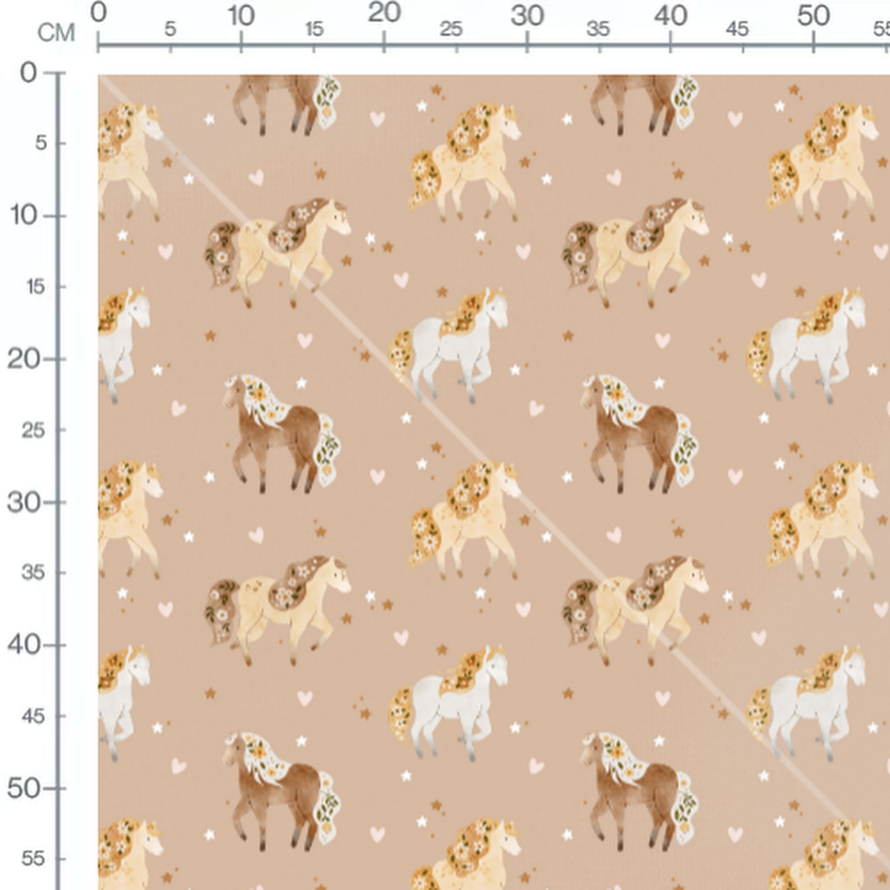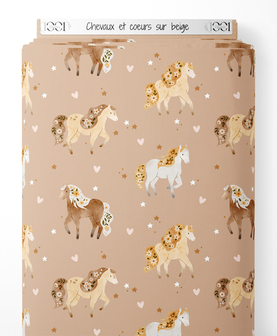 Les chevaux présentent des motifs floraux sur leurs crinières. Le fond beige est parsemé de petits cœurs et étoiles de différentes couleurs.Les tissus