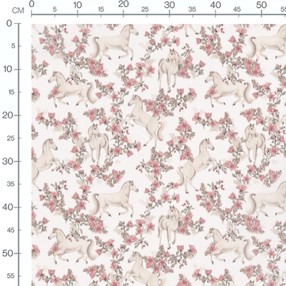 Les chevaux sont représentés dans différentes poses dynamiques. Les fleurs roses ajoutent une touche de couleur vive au motif. Les feuilles vertes complètent harmonieusement la scène florale.Les tissus