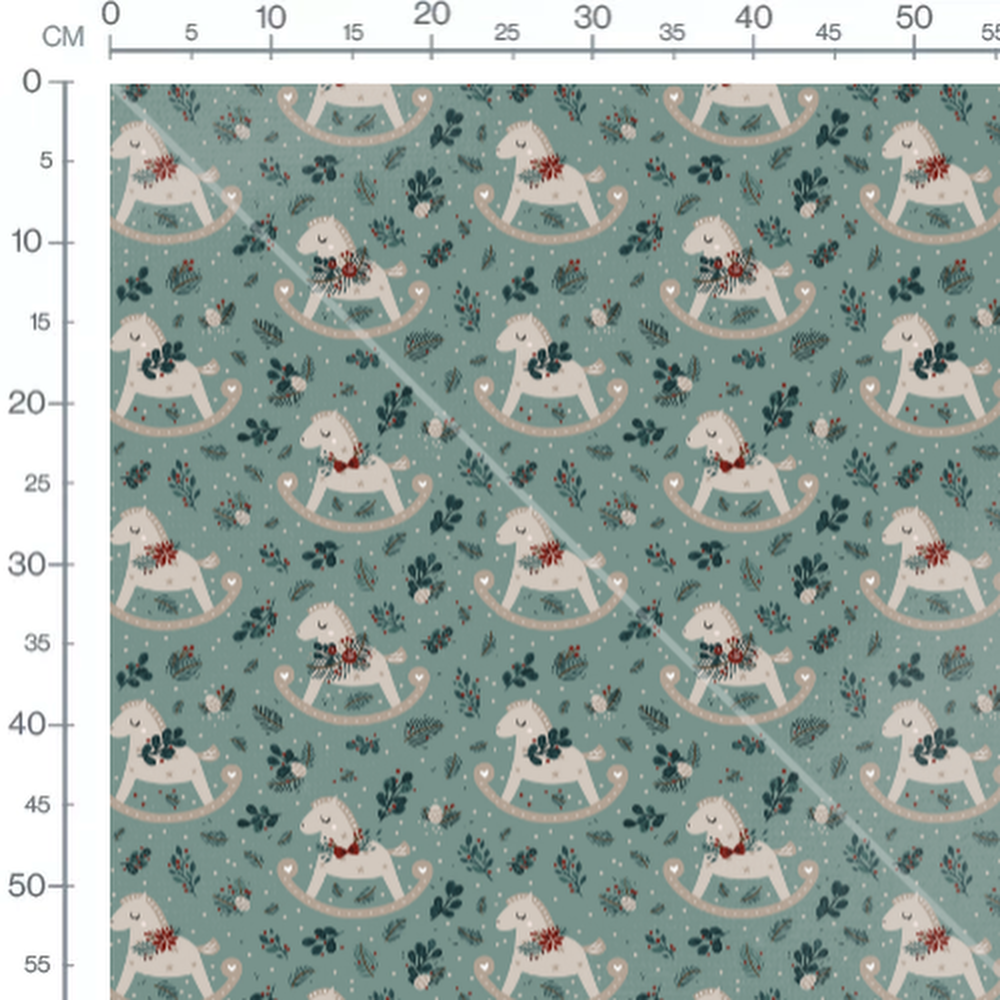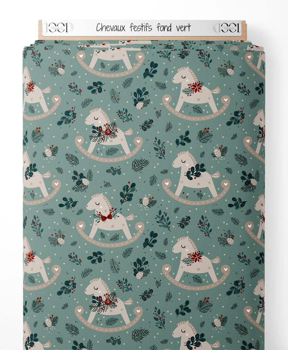 Les chevaux à bascule sont décorés de motifs floraux rouges et verts. Des branches de sapin et des baies rouges ajoutent une touche festive. De petits cœurs blancs complètent le motif. Des points blancs parsèment le fond vert.Les tissus