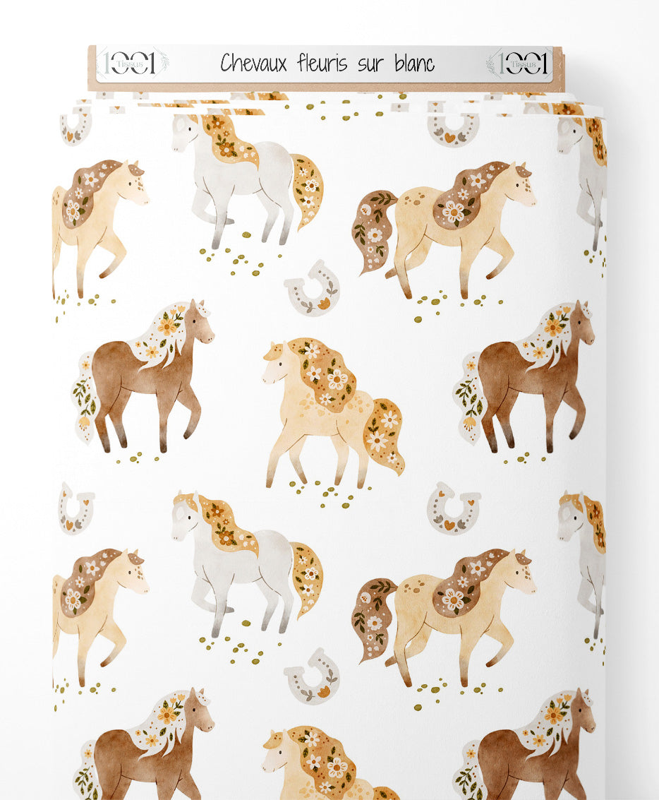 Les chevaux sont décorés de motifs floraux sur leurs crinières et queues. Les fers à cheval sont ornés de petites fleurs. De petites fleurs vertes sont dispersées autour des chevaux.Les tissus