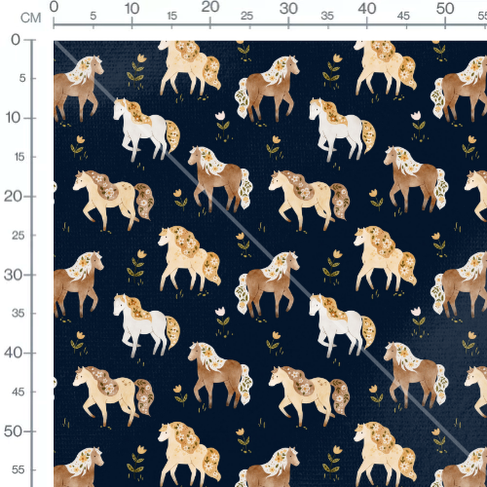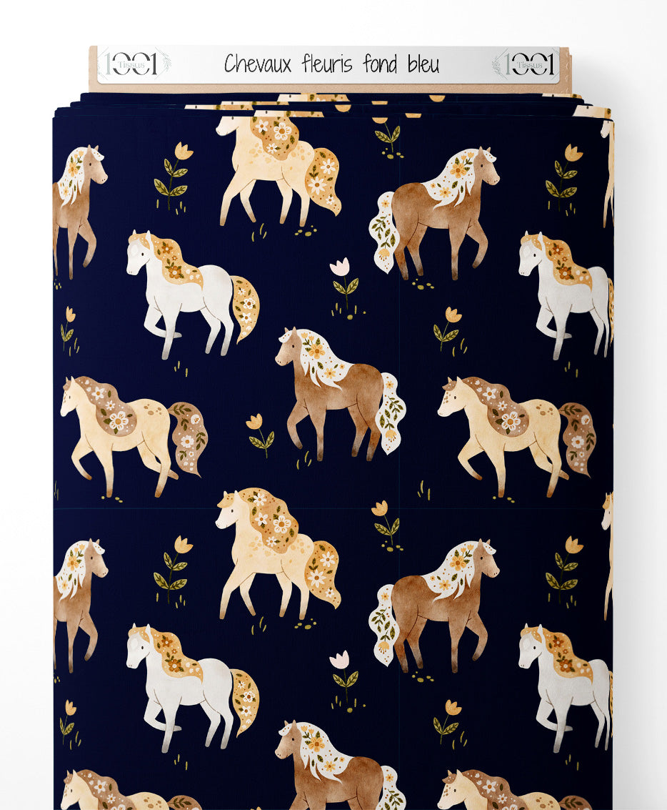 Les chevaux sont de différentes teintes de brun et blanc. Les crinières des chevaux sont ornées de motifs floraux. Des petites fleurs jaunes et blanches parsèment le fond bleu marine.Les tissus