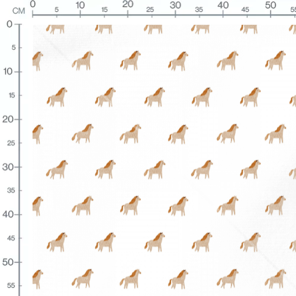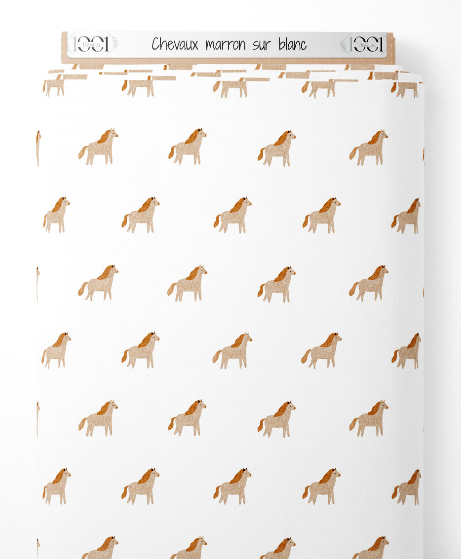 Les chevaux sont représentés avec une crinière brune distincte. Chaque cheval est dessiné avec des détails subtils sur un fond blanc pur.Les tissus