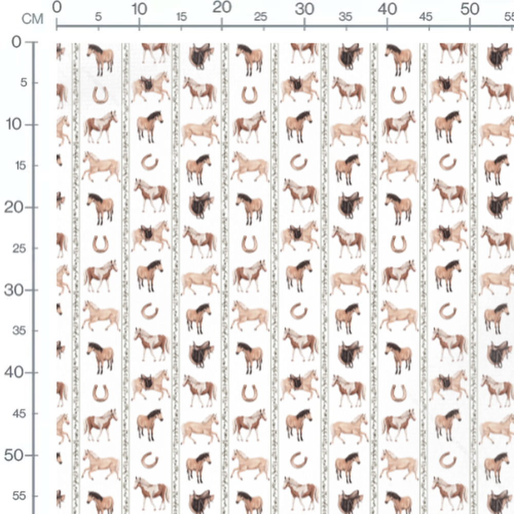 Les chevaux sont représentés dans différentes positions. Les fers à cheval et les selles ajoutent des détails équestres au motif.Les tissus