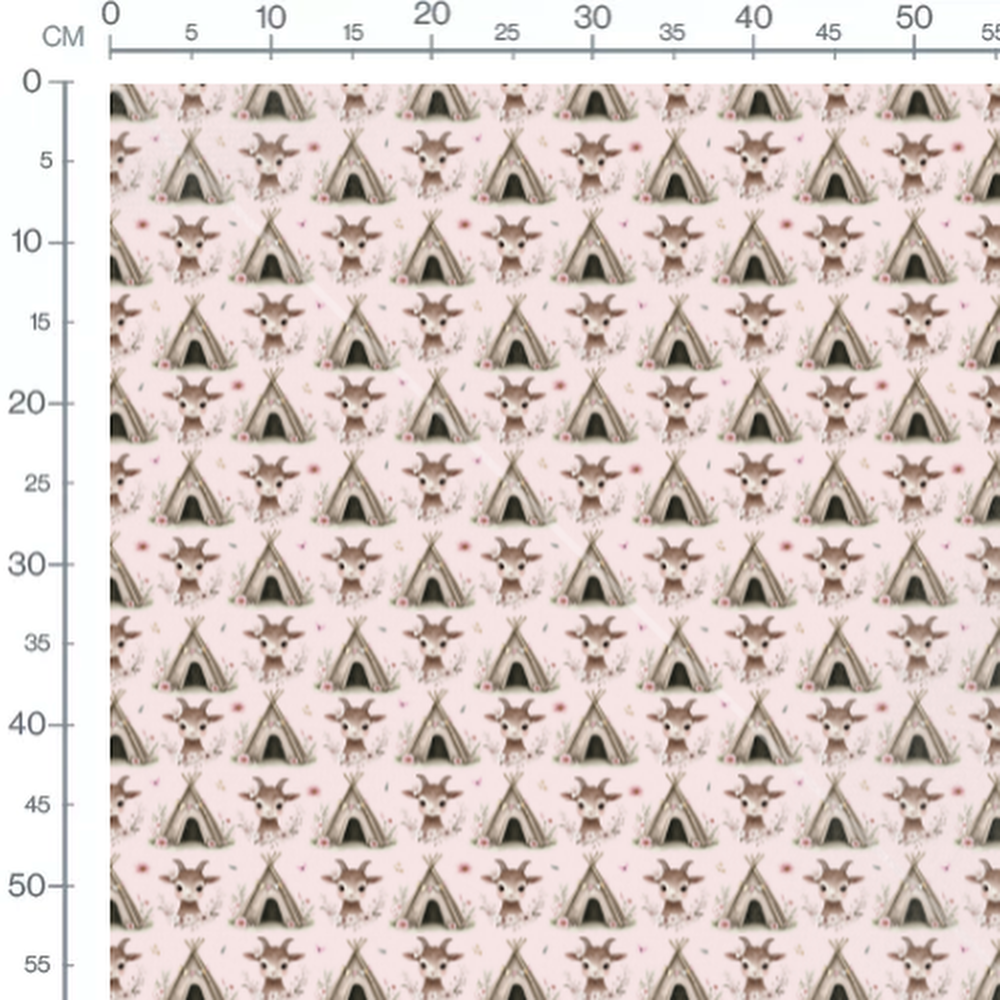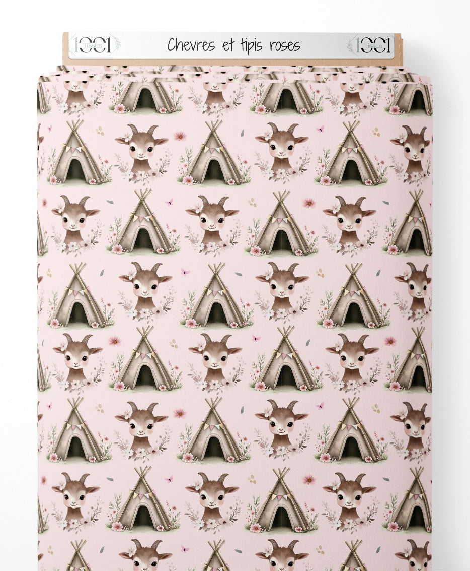 Les chèvres ont des détails floraux autour d'elles. Les tipis sont ornés de petites fleurs roses et de feuillages délicats.Les tissus