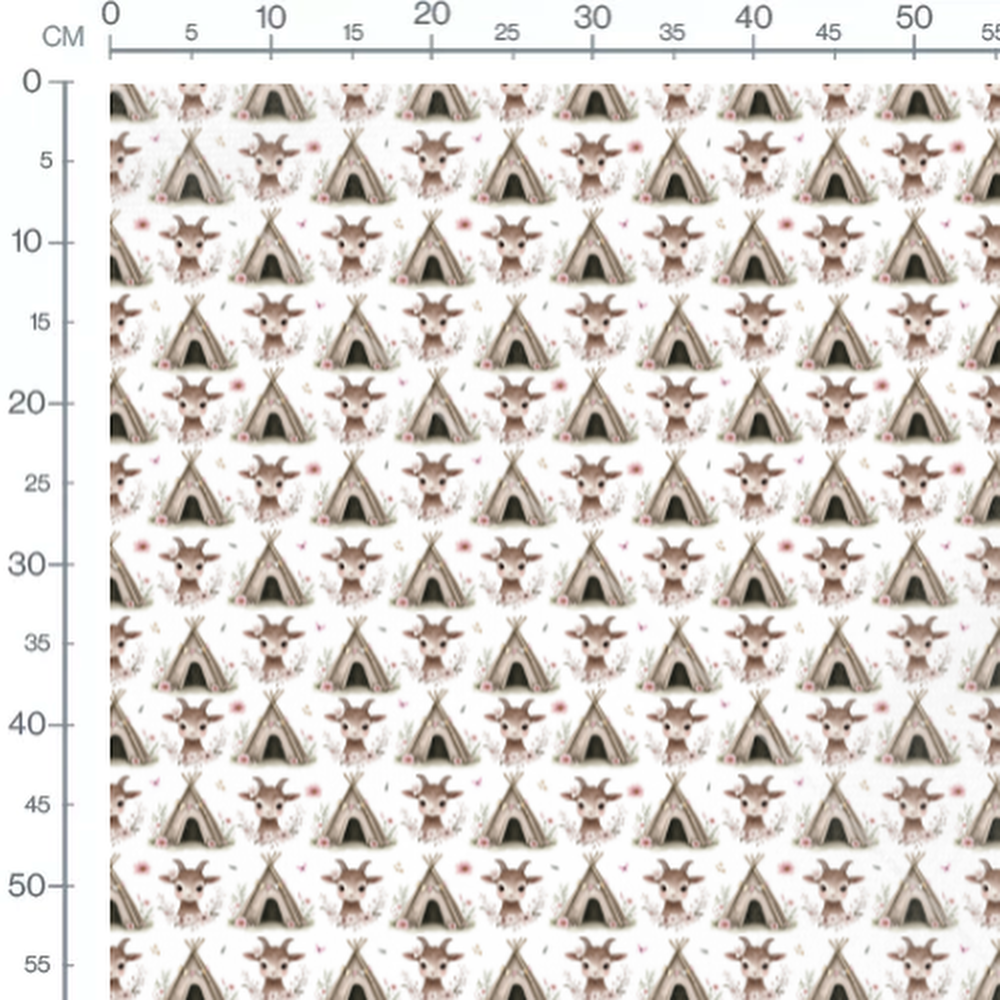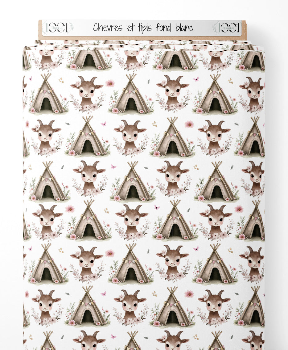 Tissu - Chèvres et tipis sur fond blanc