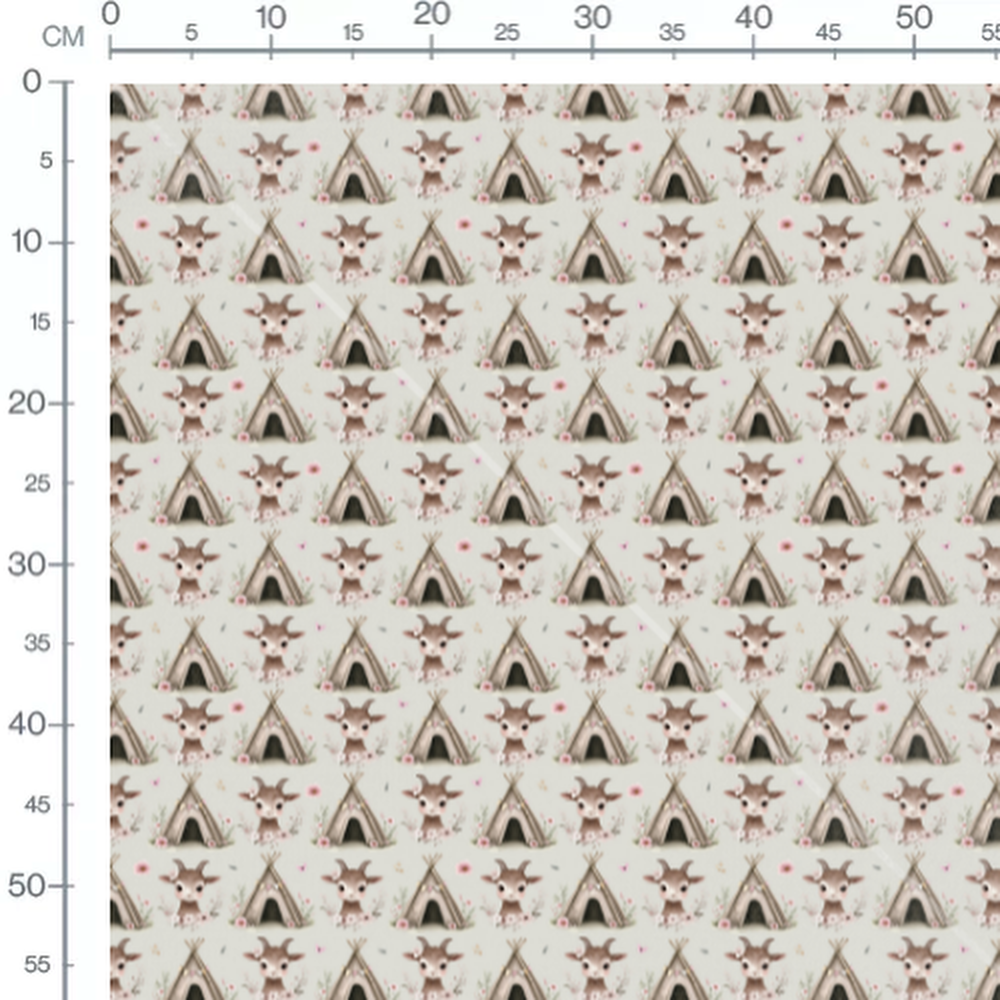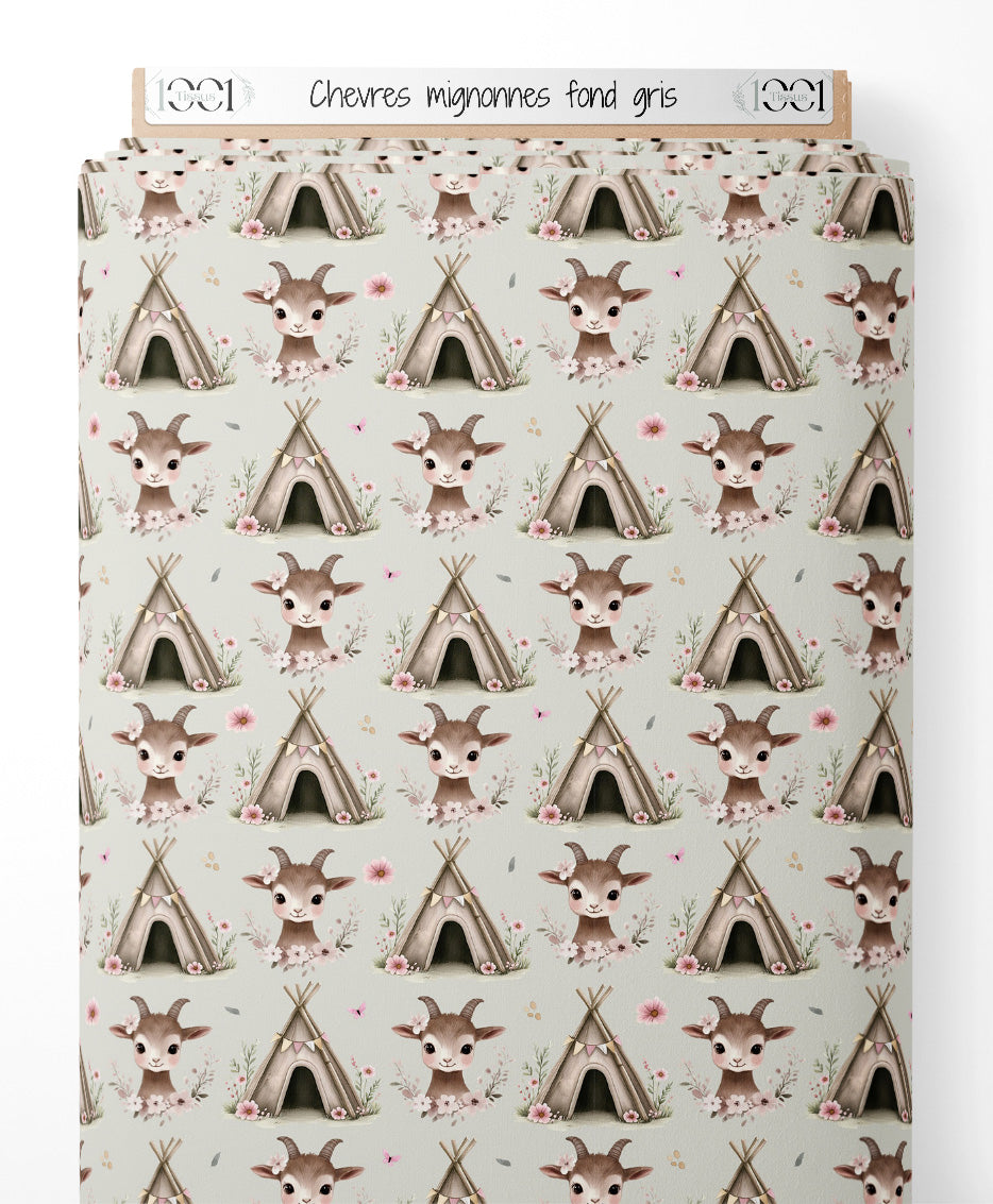 Les chèvres ont des expressions douces et sont entourées de petites fleurs. Les tipis sont ornés de guirlandes et de fleurs roses. De délicats feuillages verts complètent le motif. Quelques papillons roses ajoutent une touche de couleur.Les tissus