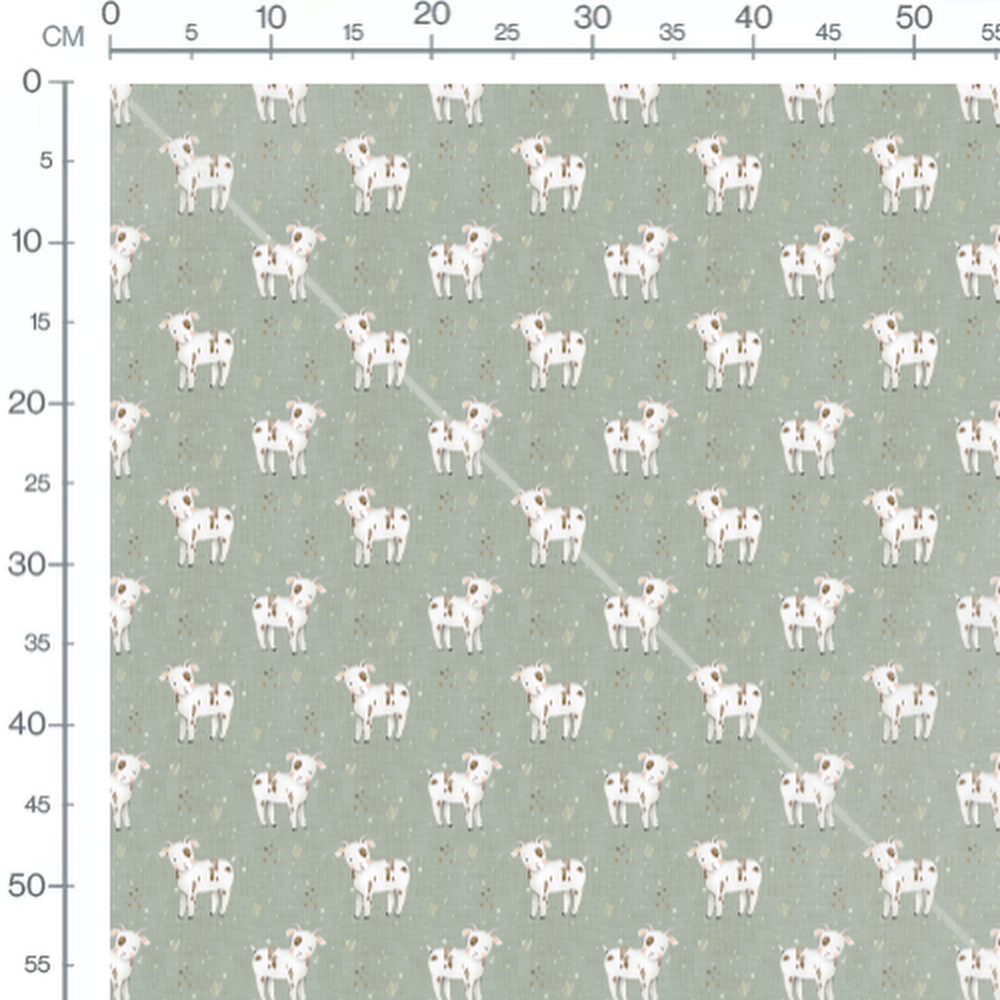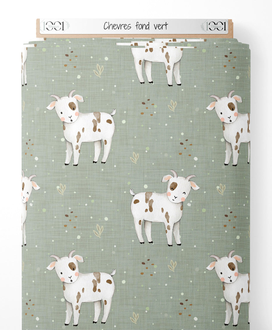 Les chèvres ont des joues roses et des cornes grises. Le fond vert est parsemé de petits points blancs et bruns. Des motifs de feuilles ajoutent une touche naturelle.Les tissus