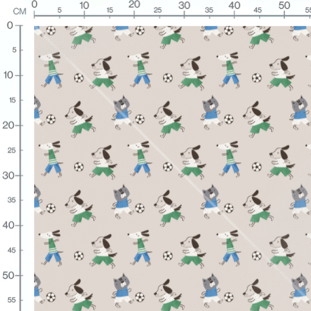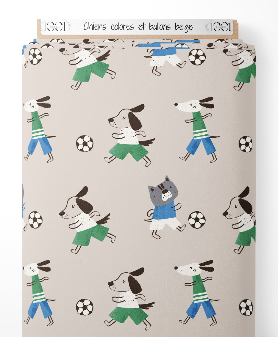 Les chiens portent des vêtements verts et bleus. Le fond beige met en valeur les motifs colorés. Les ballons de football ajoutent une touche sportive au design.Les tissus