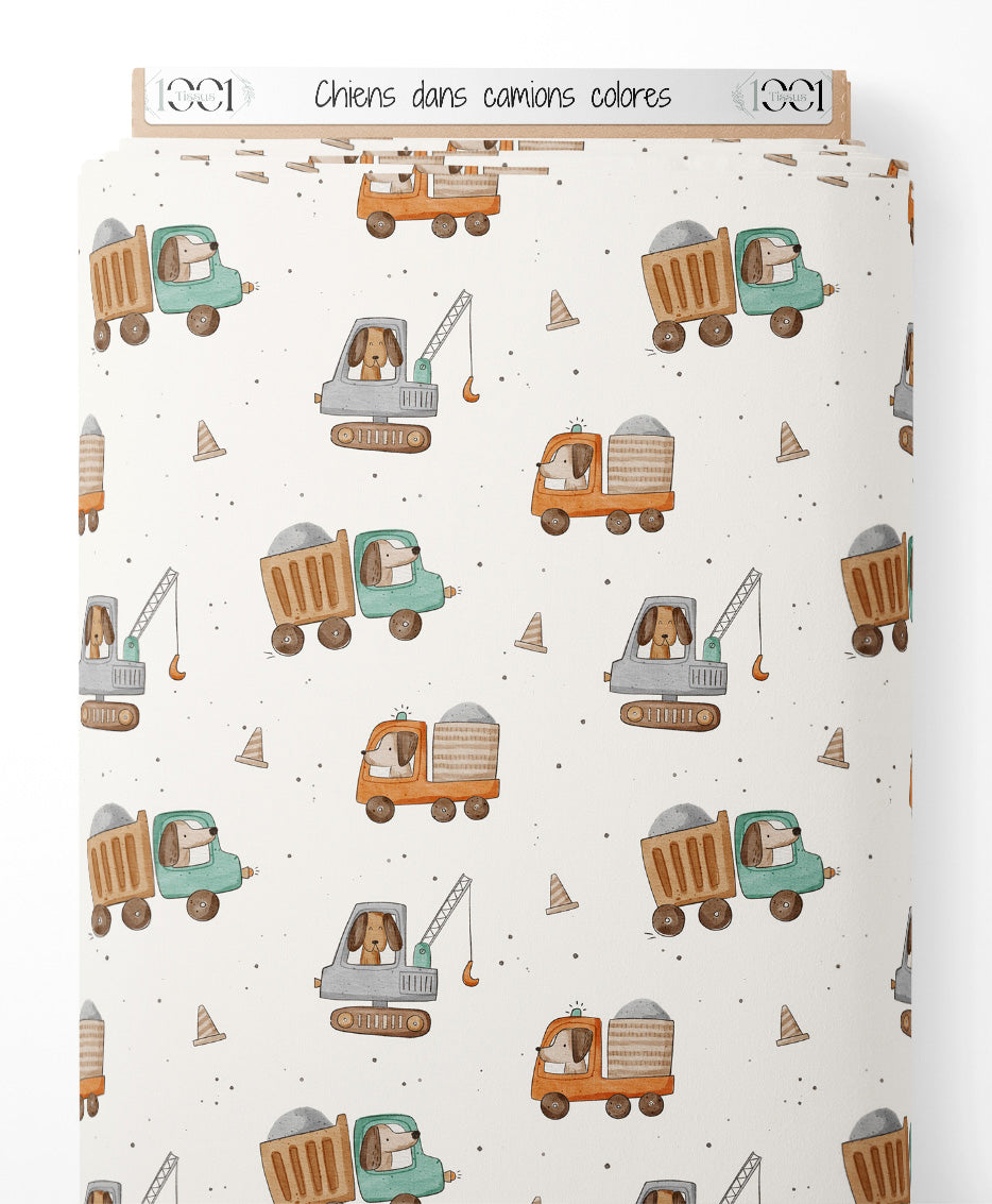 Les camions sont de différentes couleurs comme orange et vert. Les chiens sont visibles à travers les fenêtres des camions. Des cônes de signalisation et des petites taches grises complètent le motif.Les tissus