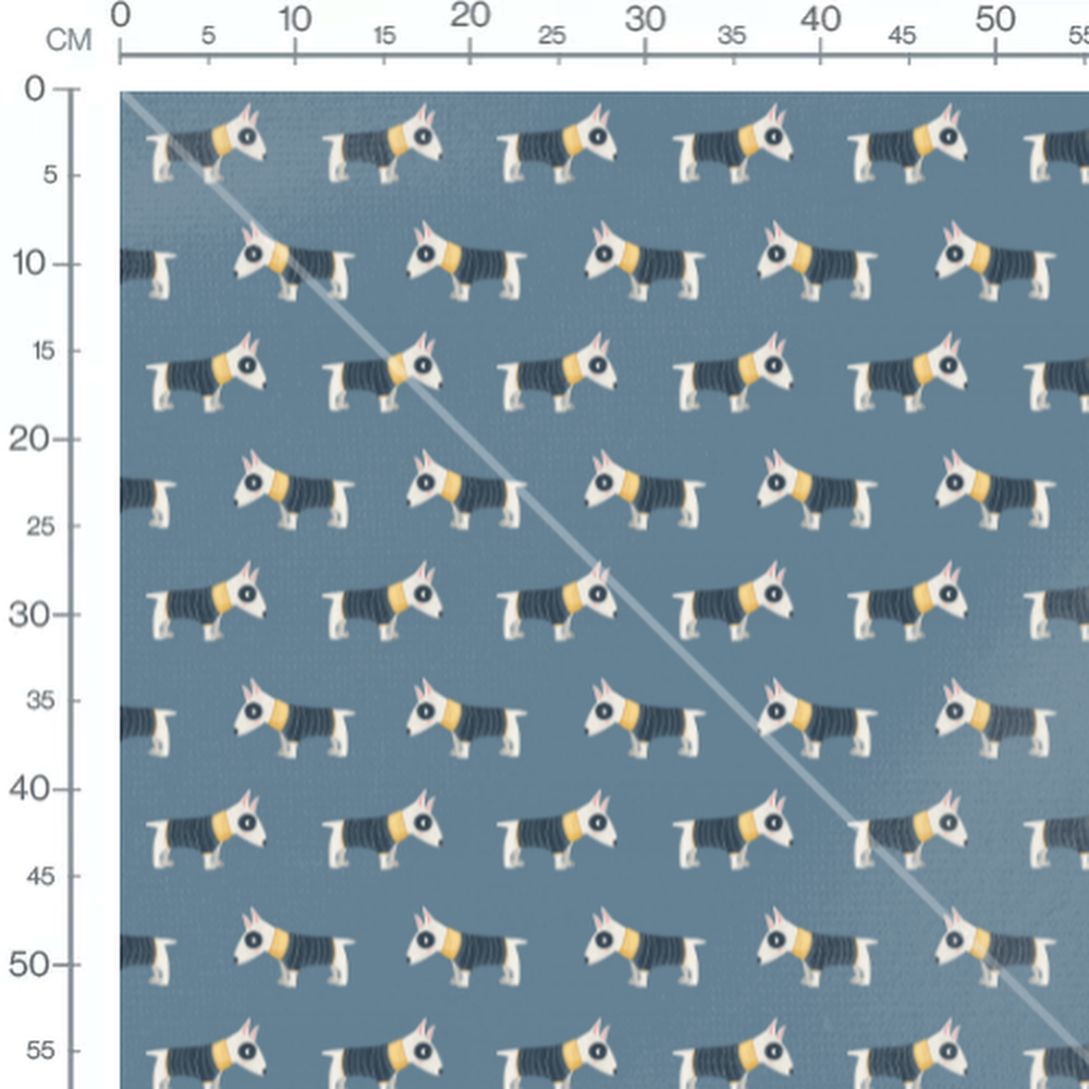 Les chiens ont un pull rayé noir et blanc. Leurs yeux sont grands et noirs. Le fond est d'un bleu uniforme.Les tissus