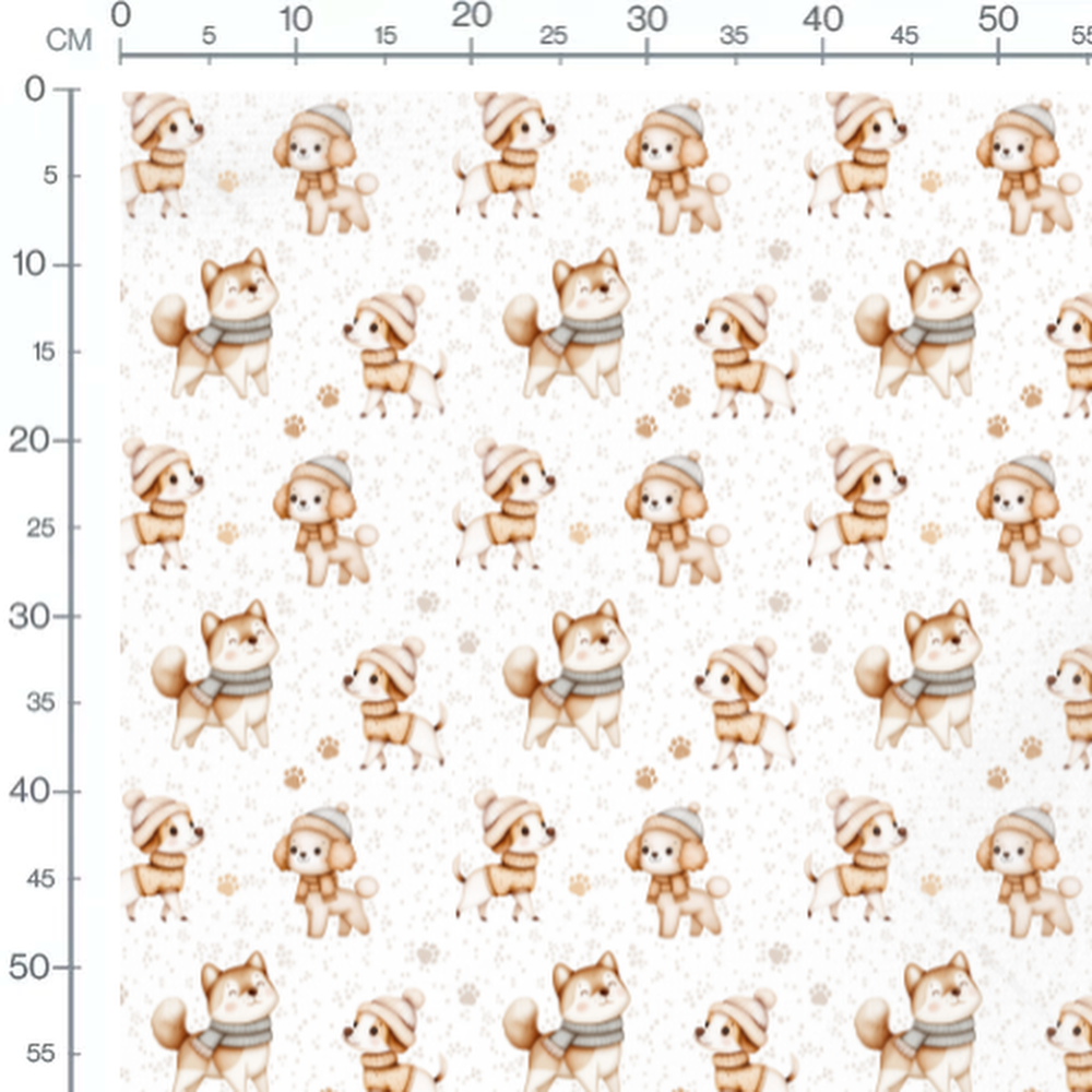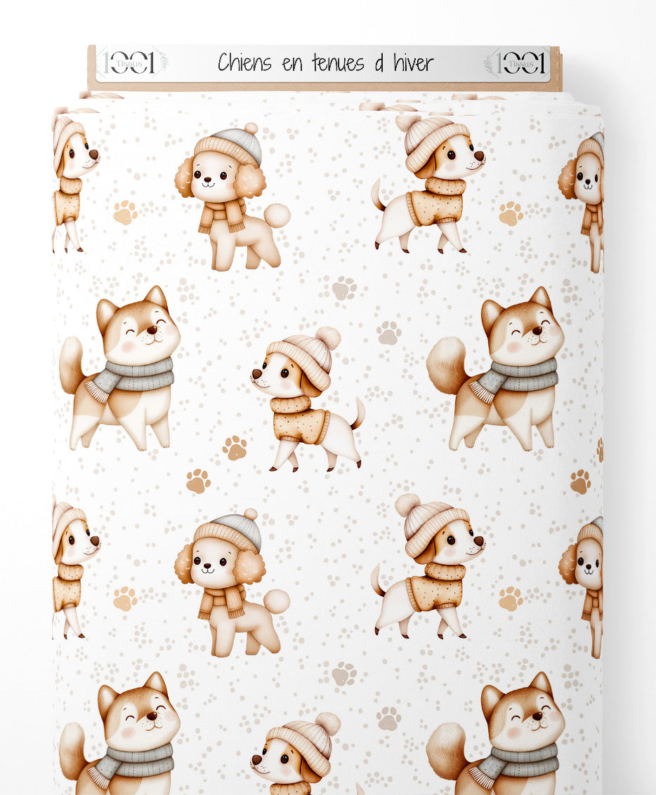 Les chiens portent des bonnets et des écharpes dans des tons beige et gris. Le fond est parsemé de petites empreintes de pattes et de points beige clair.Les tissus