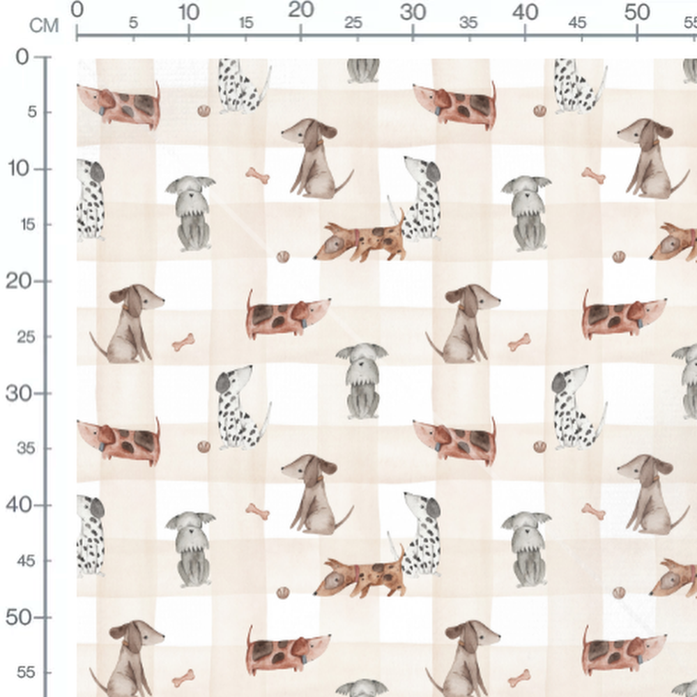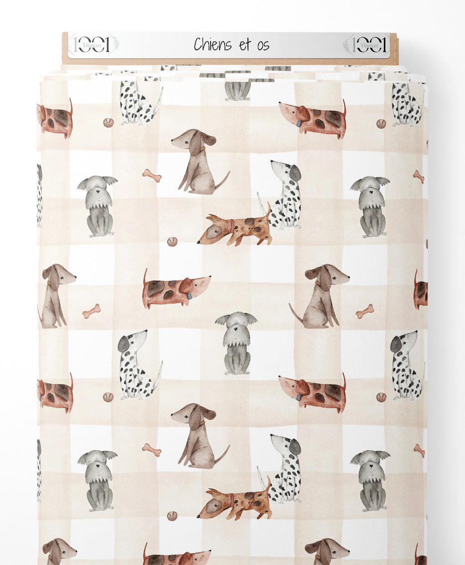 Les chiens sont de différentes races et tailles, peints dans des tons doux. Le fond à carreaux beige ajoute une touche classique au motif.Les tissus