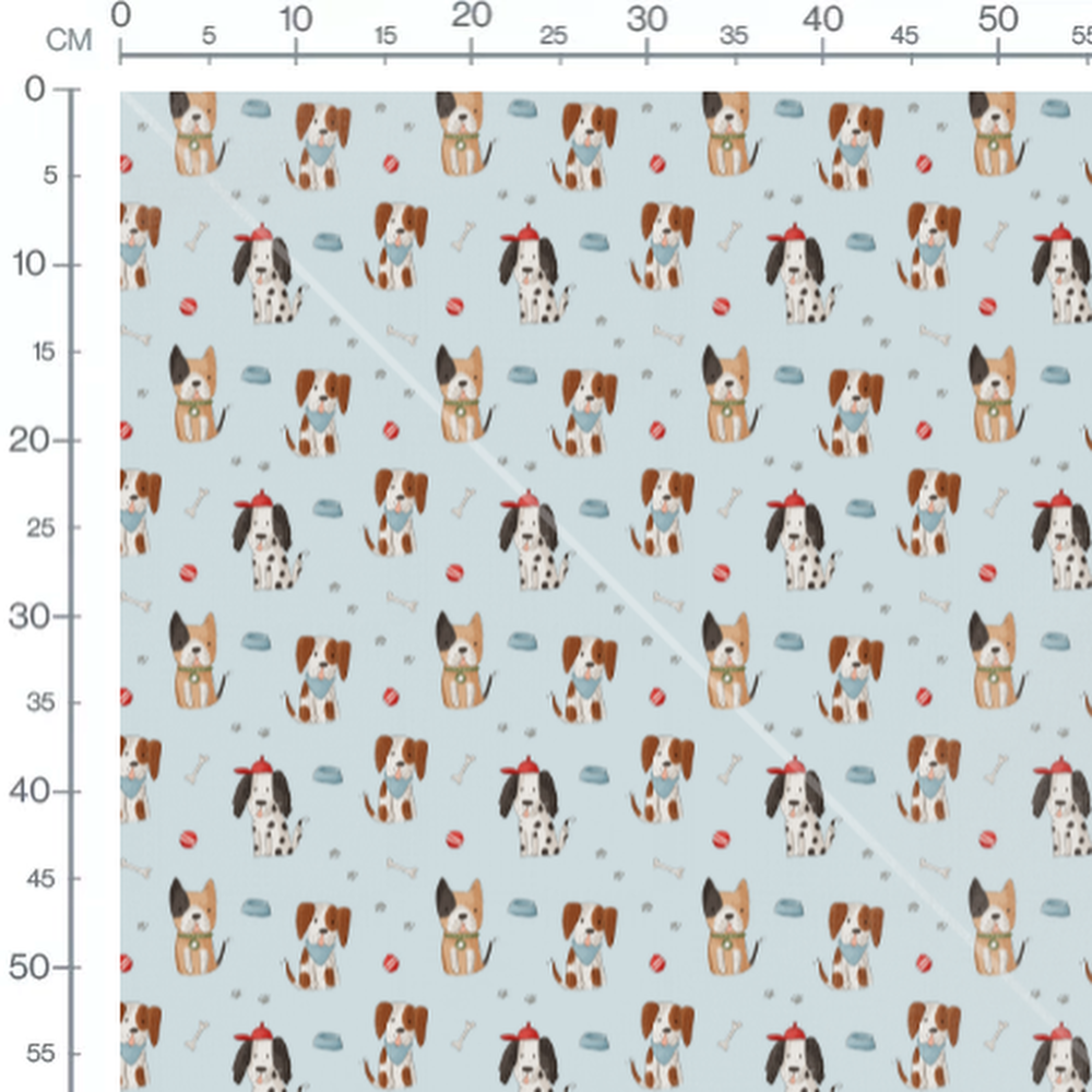 Os blancs et empreintes grises complètent le motif. Les chiens portent des accessoires comme un collier et un bandana. Un des chiens porte une casquette rouge.Les tissus