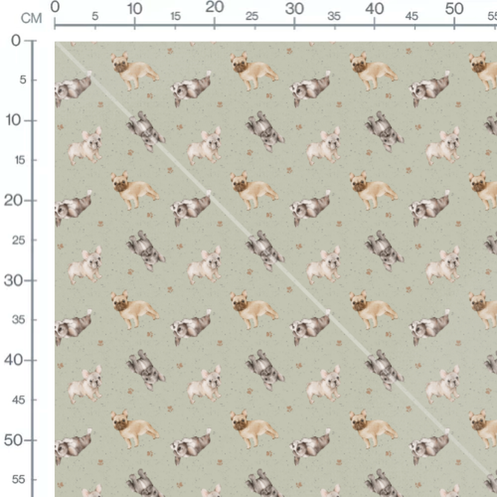 Les chiens sont représentés dans différentes positions. Le fond vert est parsemé de petites taches grises.Les tissus