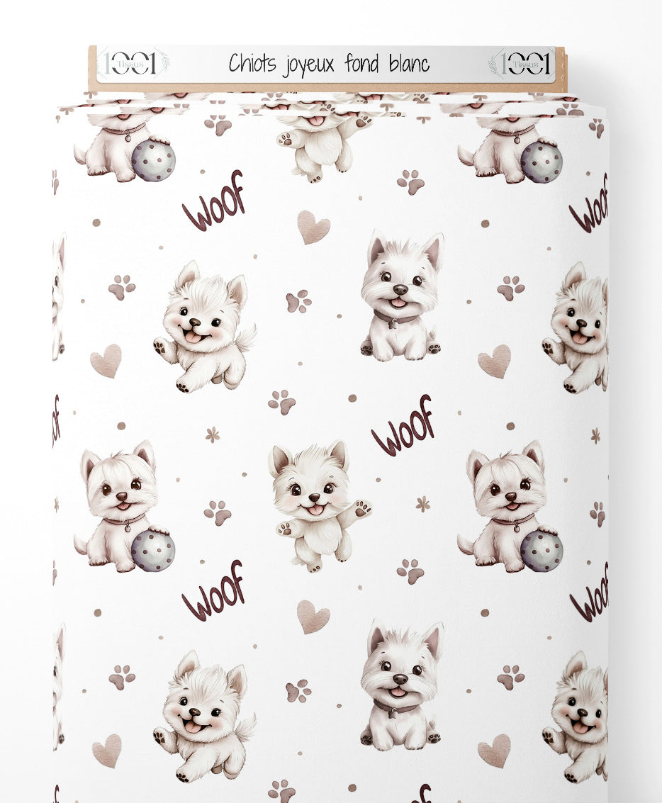 Tissu - Chiots joyeux sur fond blanc