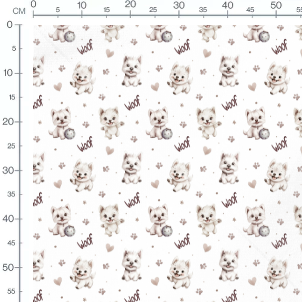 Les chiots sont accompagnés de motifs de cœurs et d'empreintes. Le mot 'Woof' est écrit en marron foncé. Les chiots ont des expressions joyeuses et jouent avec une balle grise.Les tissus