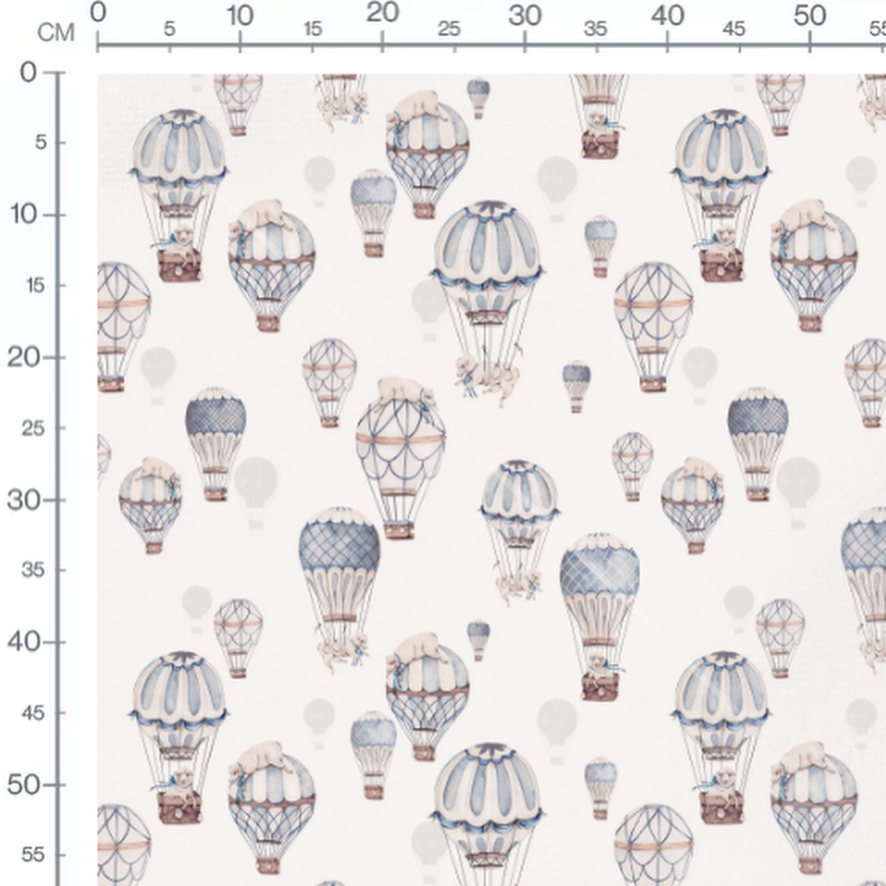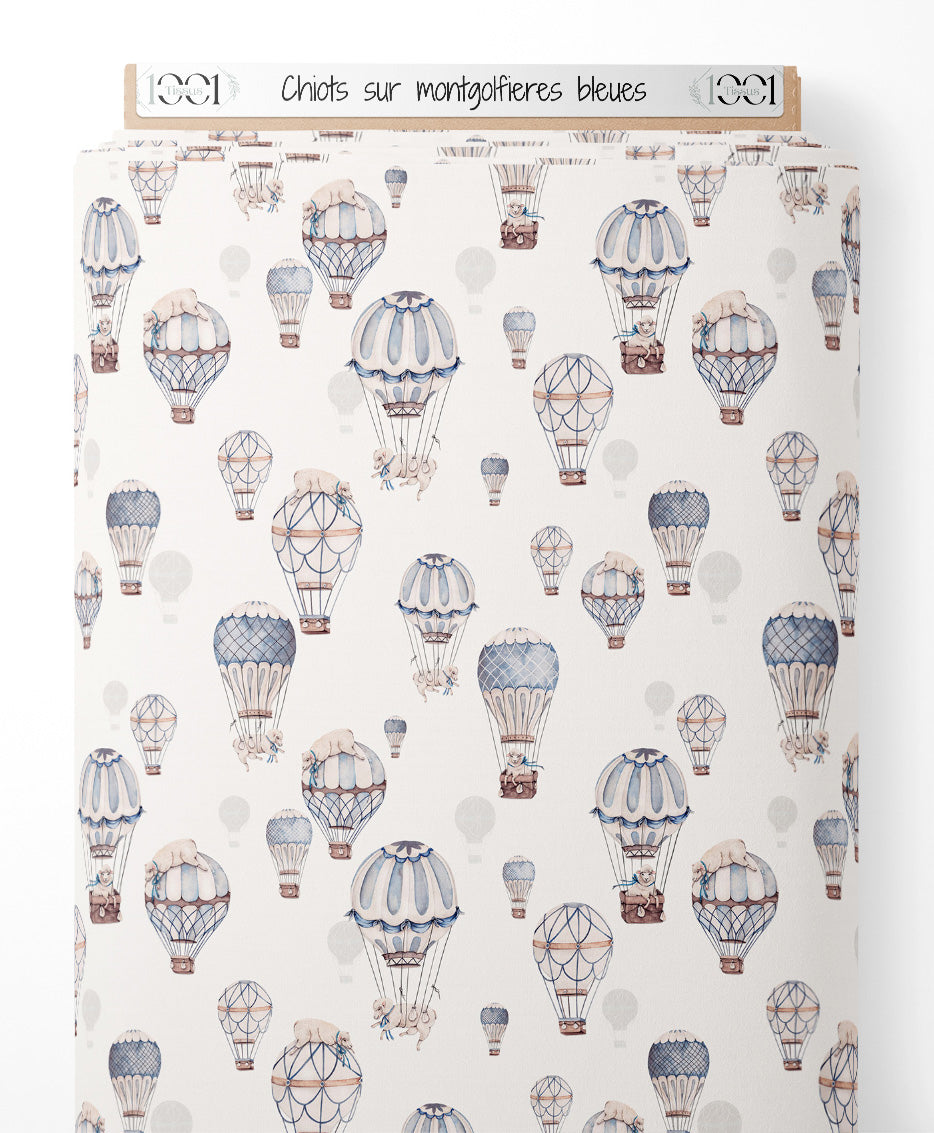 Les chiots sont assis ou couchés sur les montgolfières. Les montgolfières présentent des motifs de losanges et de lignes bleues et grises.Les tissus