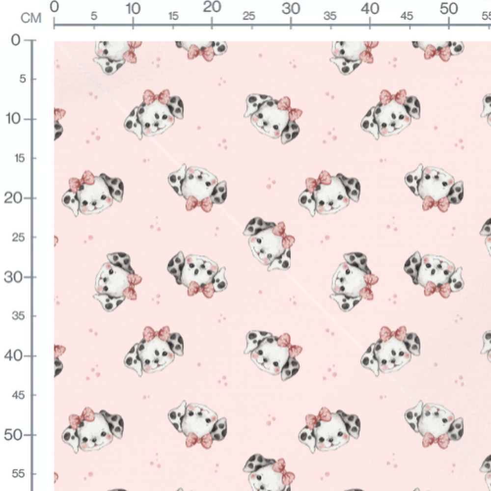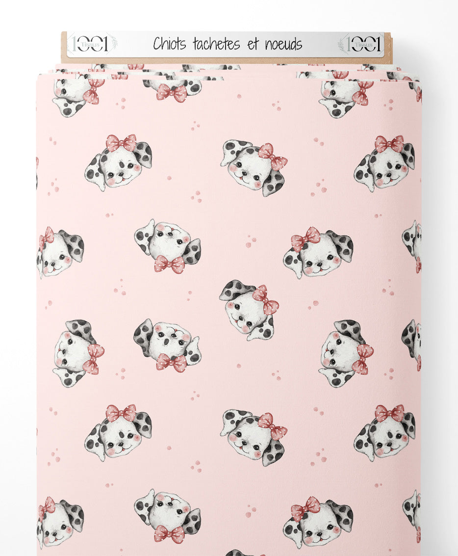 Les chiots ont des oreilles noires tachetées et portent des nœuds roses. Le fond est rose avec des petites taches roses éparpillées.Les tissus