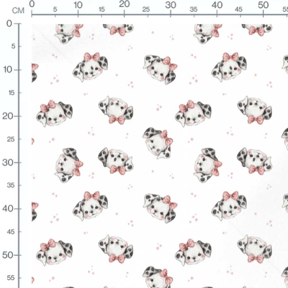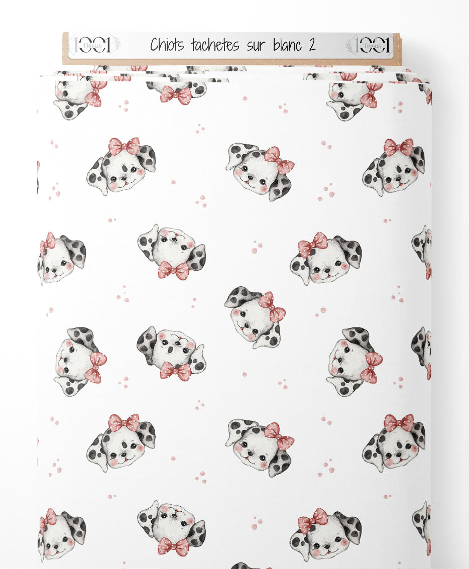 Les chiots ont des oreilles noires et blanches avec des nœuds roses. Le fond blanc est parsemé de petites taches roses.Les tissus