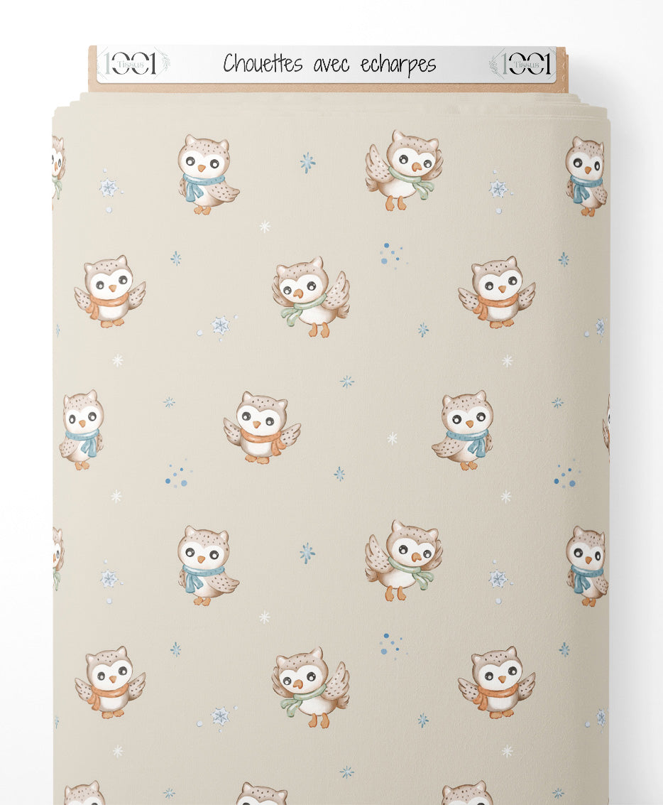 Les chouettes portent des écharpes bleues et vertes. De petits flocons de neige et des points bleus ajoutent une touche hivernale. Les chouettes ont des ailes ouvertes et des expressions joyeuses.Les tissus