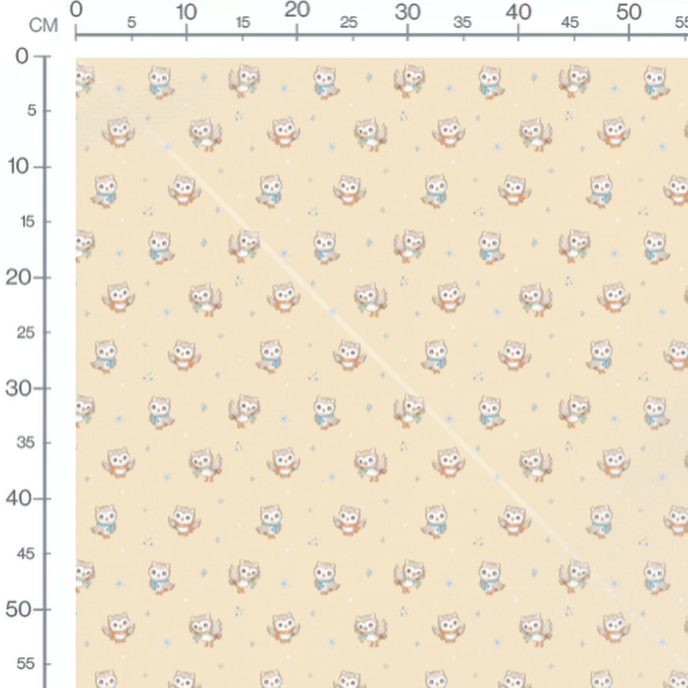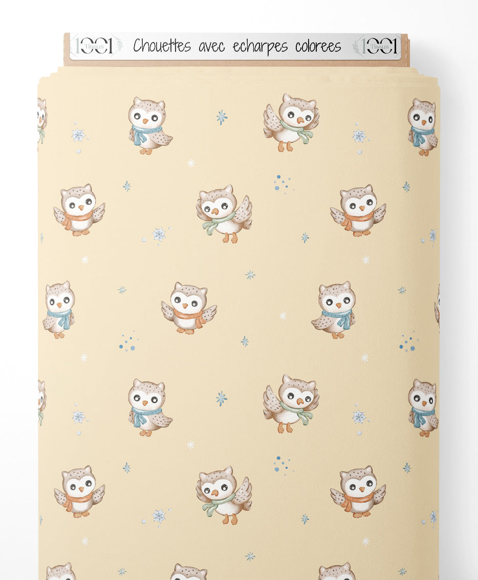 Les chouettes portent des écharpes de différentes couleurs. De petits flocons de neige et des points bleus ajoutent une touche hivernale au motif.Les tissus