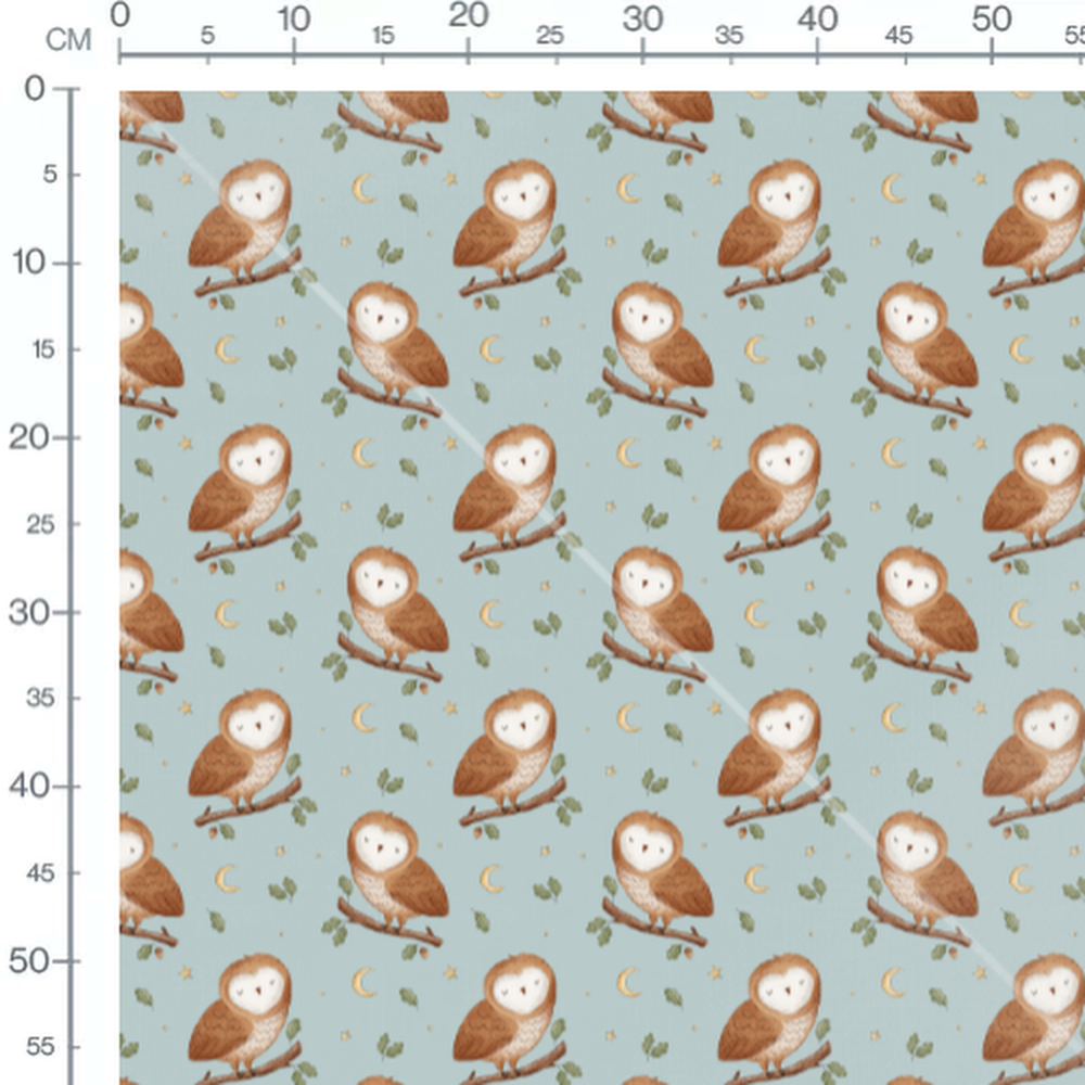 Les chouettes ont des plumes détaillées et des expressions paisibles. Les branches sont ornées de petites feuilles vertes. De petites étoiles et des croissants de lune ajoutent une touche céleste au motif.Les tissus