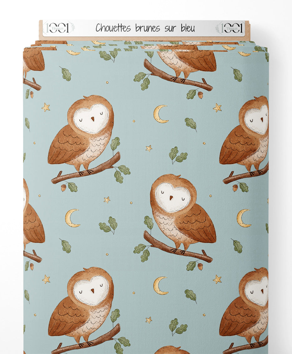 Tissu - Chouettes brunes sur bleu