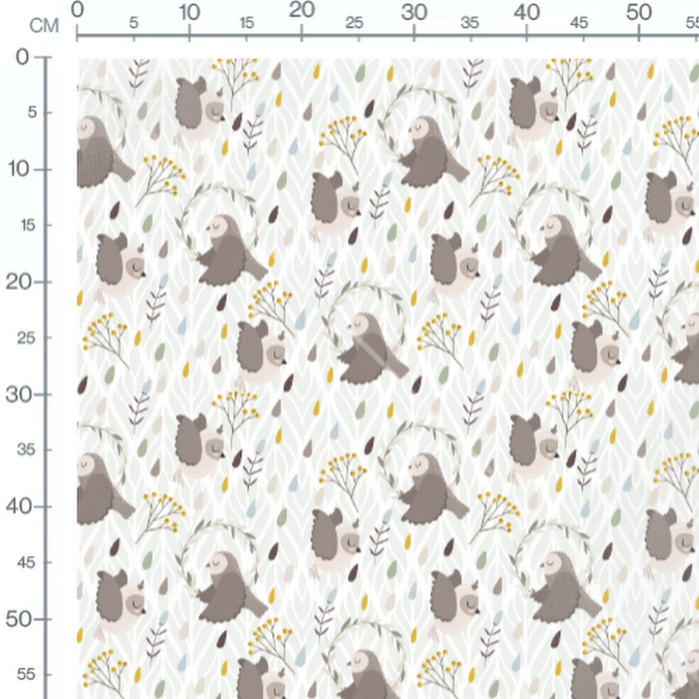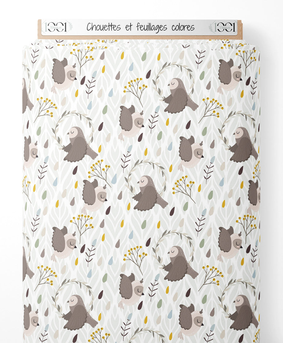 Les chouettes sont entourées de cercles de branches. Des gouttes de couleurs jaune, bleue et marron ajoutent de la variété. Les branches noires sont ornées de petites fleurs jaunes.Les tissus