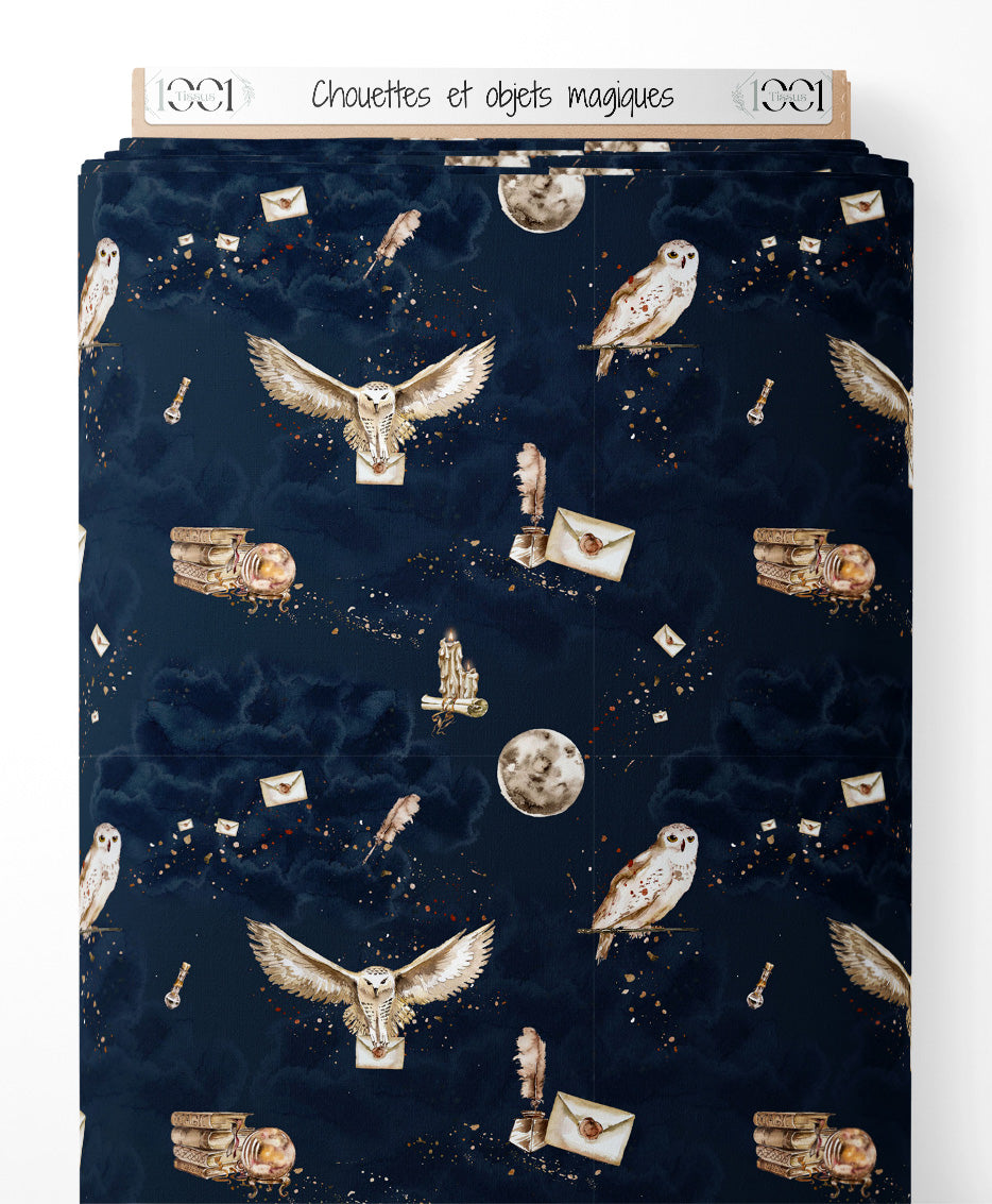Plumes et livres anciens ajoutent une touche mystique. Des fioles et des parchemins complètent le thème magique. Des éclats dorés parsèment le fond sombre.Les tissus