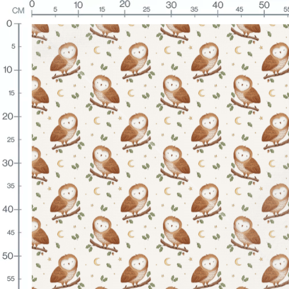 Les chouettes ont des plumes détaillées et sont posées sur des branches. Les feuilles sont d'un vert doux, ajoutant une touche naturelle. Les étoiles et les croissants de lune apportent une ambiance nocturne au motif.Les tissus