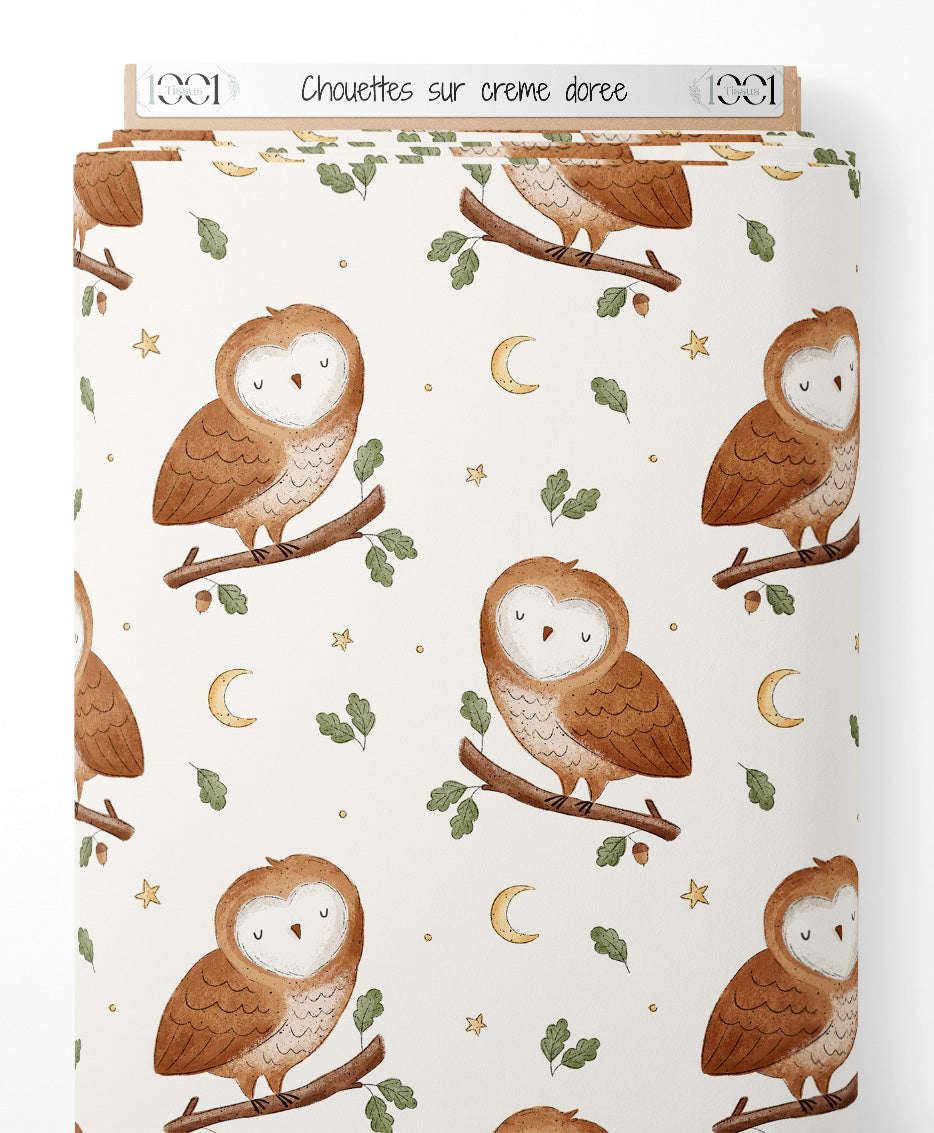 Tissu - Chouettes sur crème dorée