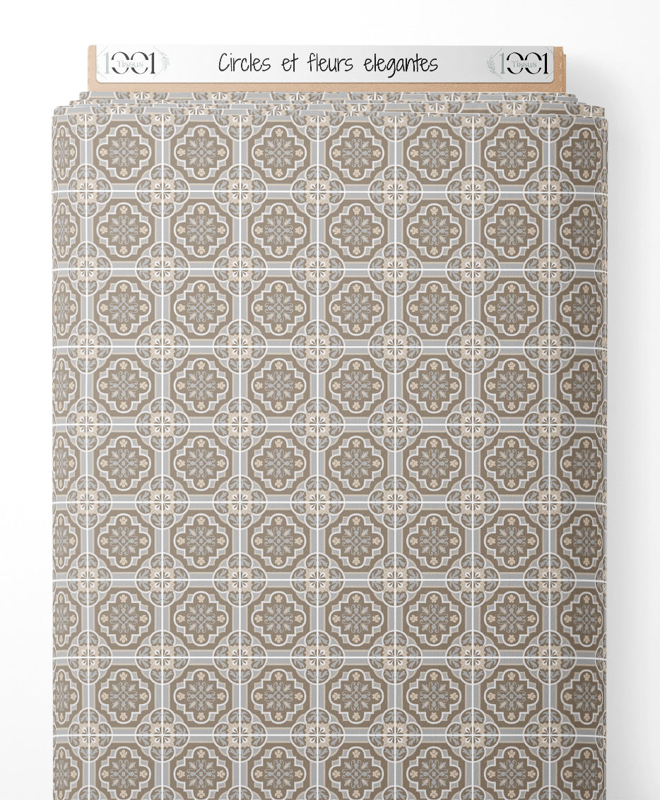 Les motifs présentent des formes circulaires et florales stylisées. Les couleurs neutres créent une ambiance élégante et classique.Les tissus
